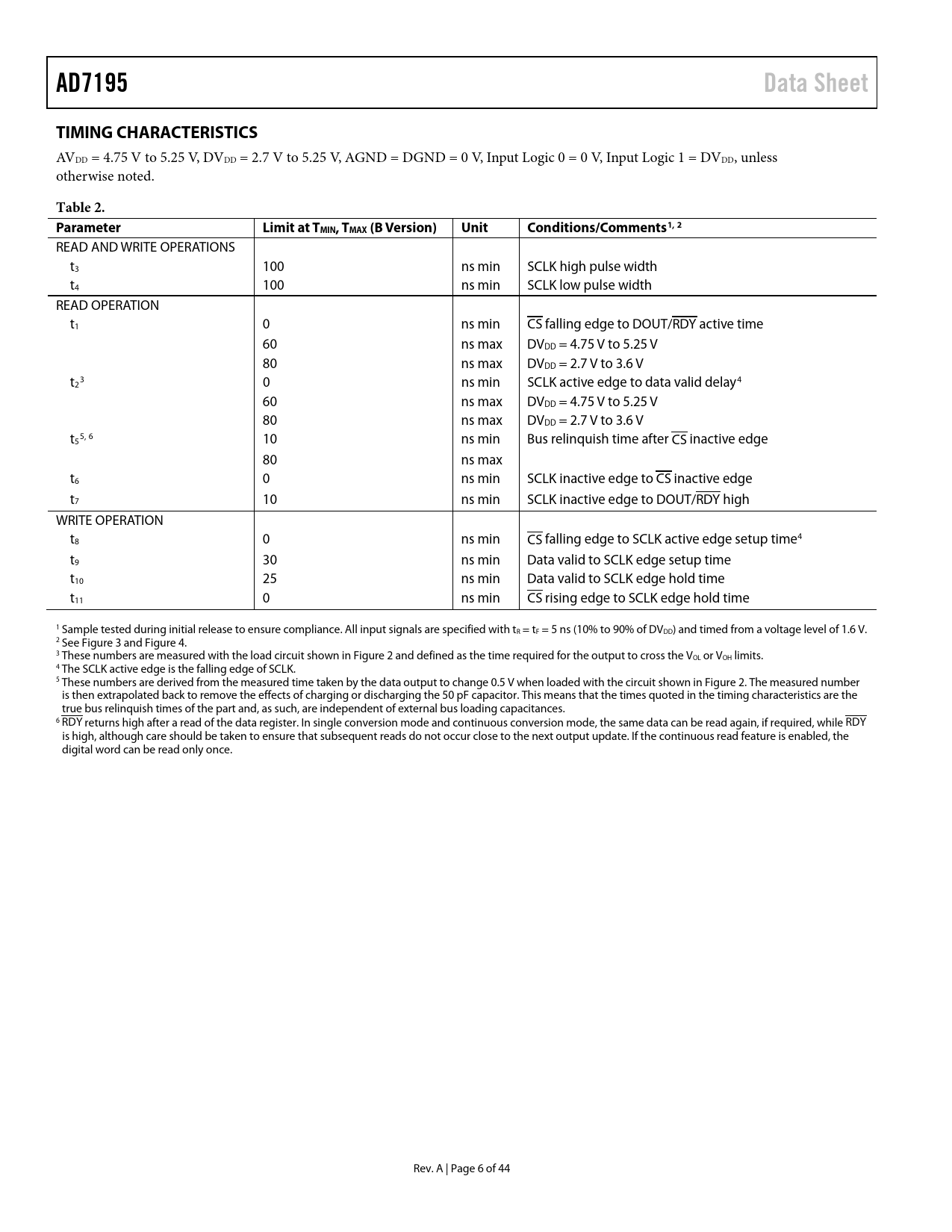 AD7195. Data Sheet. TIMING CHARACTERISTICS. Table 2. Parameter. Limit at TMIN, TMAX (B Version). Unit. Conditions/Comments1, 2