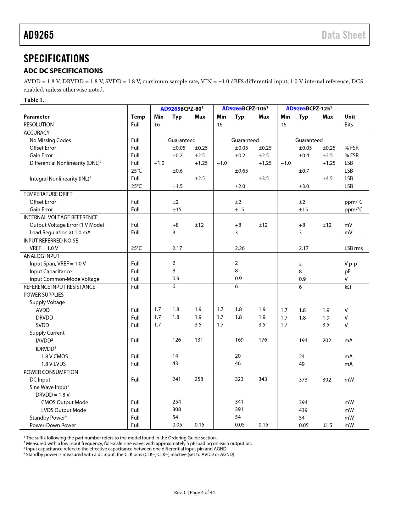 link to page 42 link to page 5 link to page 5 link to page 5 link to page 5 link to page 5 link to page 5 link to page 5 link to page 5 link to page 5 link to page 5 AD9265Data SheetSPECIFICATIONS ADC DC SPECIFICATIONS AVDD = 1.8 V, DRVDD = 1.8 V, SVDD = 1.8 V, maximum sample rate, VIN = −1.0 dBFS differential input, 1.0 V internal reference, DCS enabled, unless otherwise noted. Table 1.AD9265BCPZ-801AD9265BCPZ-1051AD9265BCPZ-1251Parameter TempMinTyp Max MinTyp Max MinTyp Max Unit RESOLUTION Full 16 16 16 Bits ACCURACY No Missing Codes Full Guaranteed Guaranteed Guaranteed Offset Error Full ±0.05 ±0.25 ±0.05 ±0.25 ±0.05 ±0.25 % FSR Gain Error Full ±0.2 ±2.5 ±0.2 ±2.5 ±0.4 ±2.5 % FSR Differential Nonlinearity (DNL)2 Full −1.0 +1.25 −1.0 +1.25 −1.0 +1.25 LSB 25°C ±0.6 ±0.65 ±0.7 LSB Integral Nonlinearity (INL)2 Full ±2.5 ±3.5 ±4.5 LSB 25°C ±1.5 ±2.0 ±3.0 LSB TEMPERATURE DRIFT Offset Error Full ±2 ±2 ±2 ppm/°C Gain Error Full ±15 ±15 ±15 ppm/°C INTERNAL VOLTAGE REFERENCE Output Voltage Error (1 V Mode) Full +8 ±12 +8 ±12 +8 ±12 mV Load Regulation at 1.0 mA Full 3 3 3 mV INPUT REFERRED NOISE VREF = 1.0 V 25°C 2.17 2.26 2.17 LSB rms ANALOG INPUT Input Span, VREF = 1.0 V Full 2 2 2 V p-p Input Capacitance3 Full 8 8 8 pF Input Common-Mode Voltage Full 0.9 0.9 0.9 V REFERENCE INPUT RESISTANCE Full 6 6 6 kΩ POWER SUPPLIES Supply Voltage AVDD Full 1.7 1.8 1.9 1.7 1.8 1.9 1.7 1.8 1.9 V DRVDD Full 1.7 1.8 1.9 1.7 1.8 1.9 1.7 1.8 1.9 V SVDD Full 1.7 3.5 1.7 3.5 1.7 3.5 V Supply Current IAVDD2 Full 126 131 169 176 194 202 mA IDRVDD2 1.8 V CMOS Full 14 20 24 mA 1.8 V LVDS Full 43 46 49 mA POWER CONSUMPTION DC Input Full 241 258 323 343 373 392 mW Sine Wave Input2 DRVDD = 1.8 V CMOS Output Mode Full 254 341 394 mW LVDS Output Mode Full 308 391 439 mW Standby Power4 Full 54 54 54 mW Power-Down Power Full 0.05 0.15 0.05 0.15 0.05 .015 mW 1 The suffix following the part number refers to the model found in the Ordering Guide section. 2 Measured with a low input frequency, full-scale sine wave, with approximately 5 pF loading on each output bit. 3 Input capacitance refers to the effective capacitance between one differential input pin and AGND. 4 Standby power is measured with a dc input, the CLK pins (CLK+, CLK−) inactive (set to AVDD or AGND). Rev. C | Page 4 of 44 Document Outline Features Applications Product Highlights Functional Block Diagram Table of Contents Revision History General Description Specifications ADC DC Specifications ADC AC Specifications Digital Specifications Switching Specifications Timing Specifications Timing Diagrams Absolute Maximum Ratings Thermal Characteristics ESD Caution Pin Configurations and Function Descriptions Typical Performance Characteristics Equivalent Circuits Theory of Operation ADC Architecture Analog Input Considerations Input Common Mode Dither Large Signal FFT Small Signal FFT Static Linearity Differential Input Configurations Voltage Reference Internal Reference Connection External Reference Operation Clock Input Considerations Clock Input Options Clock Duty Cycle Input Clock Divider Jitter Considerations Power Dissipation and Standby Mode Digital Outputs Digital Output Enable Function (OEB) Timing Data Clock Output (DCO) Built-In Self-Test (BIST) and Output Test Built-In Self-Test (BIST) Output Test Modes Serial Port Interface (SPI) Configuration Using the SPI Hardware Interface Configuration Without the SPI SPI Accessible Features Memory Map Reading the Memory Map Register Table Open Locations Default Values Logic Levels Transfer Register Map Memory Map Register Table Memory Map Register Descriptions Sync Control (Register 0x100) Applications Information Design Guidelines Power and Ground Recommendations LVDS Operation Exposed Paddle Thermal Heat Slug Recommendations VCM RBIAS Reference Decoupling SPI Port Outline Dimensions Ordering Guide