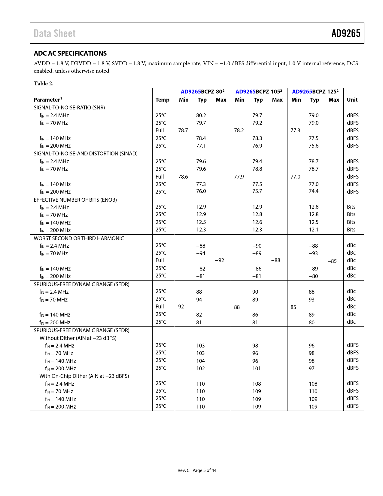 SIGNAL-TO-NOISE-RATIO (SNR) fIN = 2.4 MHz 25°C 80.2 79.7 79.0 dBFS fIN = 70 MHz 25°C 79.7 79.2 79.0 dBFS Full 78.7 78.2 77.3 dBFS fIN = 140 MHz 25°C 78.4 78.3 77.5 dBFS fIN = 200 MHz 25°C 77.1 76.9 75.6 dBFS SIGNAL-TO-NOISE-AND DISTORTION (SINAD) fIN = 2.4 MHz 25°C 79.6 79.4 78.7 dBFS fIN = 70 MHz 25°C 79.6 78.8 78.7 dBFS Full 78.6 77.9 77.0 dBFS fIN = 140 MHz 25°C 77.3 77.5 77.0 dBFS fIN = 200 MHz 25°C 76.0 75.7 74.4 dBFS EFFECTIVE NUMBER OF BITS (ENOB) fIN = 2.4 MHz 25°C 12.9 12.9 12.8 Bits fIN = 70 MHz 25°C 12.9 12.8 12.8 Bits fIN = 140 MHz 25°C 12.5 12.6 12.5 Bits fIN = 200 MHz 25°C 12.3 12.3 12.1 Bits WORST SECOND OR THIRD HARMONIC fIN = 2.4 MHz 25°C −88 −90 −88 dBc fIN = 70 MHz 25°C −94 −89 −93 dBc Full −92 −88 −85 dBc fIN = 140 MHz 25°C −82 −86 −89 dBc fIN = 200 MHz 25°C −81 −81 −80 dBc SPURIOUS-FREE DYNAMIC RANGE (SFDR) fIN = 2.4 MHz 25°C 88 90 88 dBc fIN = 70 MHz 25°C 94 89 93 dBc Full 92 88 85 dBc fIN = 140 MHz 25°C 82 86 89 dBc fIN = 200 MHz 25°C 81 81 80 dBc SPURIOUS-FREE DYNAMIC RANGE (SFDR) Without Dither (AIN at −23 dBFS) fIN = 2.4 MHz 25°C 103 98 96 dBFS fIN = 70 MHz 25°C 103 96 98 dBFS fIN = 140 MHz 25°C 104 96 98 dBFS fIN = 200 MHz 25°C 102 101 97 dBFS With On-Chip Dither (AIN at −23 dBFS) fIN = 2.4 MHz 25°C 110 108 108 dBFS fIN = 70 MHz 25°C 110 109 110 dBFS fIN = 140 MHz 25°C 110 109 109 dBFS fIN = 200 MHz 25°C 110 109 109 dBFS Rev. C | Page 5 of 44 Document Outline Features Applications Product Highlights Functional Block Diagram Table of Contents Revision History General Description Specifications ADC DC Specifications ADC AC Specifications Digital Specifications Switching Specifications Timing Specifications Timing Diagrams Absolute Maximum Ratings Thermal Characteristics ESD Caution Pin Configurations and Function Descriptions Typical Performance Characteristics Equivalent Circuits Theory of Operation ADC Architecture Analog Input Considerations Input Common Mode Dither Large Signal FFT Small Signal FFT Static Linearity Differential Input Configurations Voltage Reference Internal Reference Connection External Reference Operation Clock Input Considerations Clock Input Options Clock Duty Cycle Input Clock Divider Jitter Considerations Power Dissipation and Standby Mode Digital Outputs Digital Output Enable Function (OEB) Timing Data Clock Output (DCO) Built-In Self-Test (BIST) and Output Test Built-In Self-Test (BIST) Output Test Modes Serial Port Interface (SPI) Configuration Using the SPI Hardware Interface Configuration Without the SPI SPI Accessible Features Memory Map Reading the Memory Map Register Table Open Locations Default Values Logic Levels Transfer Register Map Memory Map Register Table Memory Map Register Descriptions Sync Control (Register 0x100) Applications Information Design Guidelines Power and Ground Recommendations LVDS Operation Exposed Paddle Thermal Heat Slug Recommendations VCM RBIAS Reference Decoupling SPI Port Outline Dimensions Ordering Guide