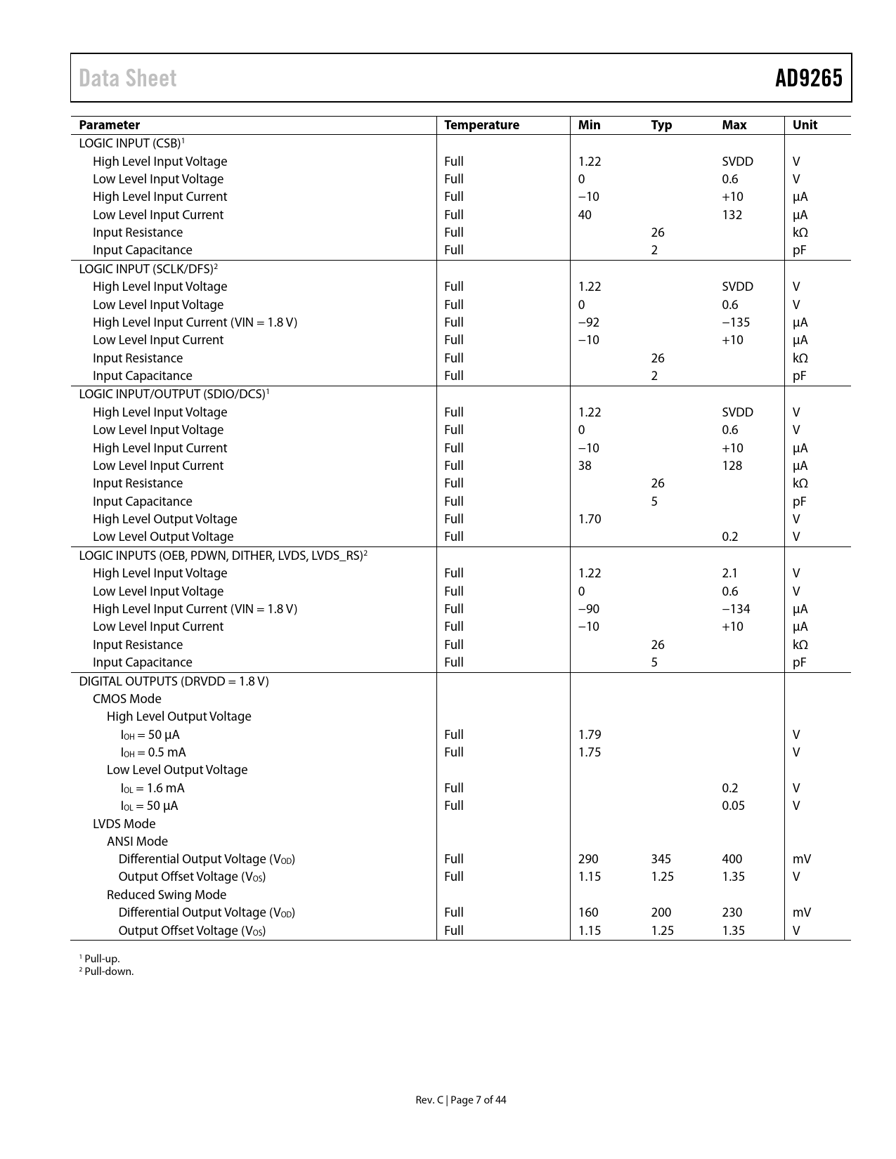 link to page 8 link to page 8 link to page 8 link to page 8 Data SheetAD9265Parameter TemperatureMinTypMaxUnit LOGIC INPUT (CSB)1 High Level Input Voltage Full 1.22 SVDD V Low Level Input Voltage Full 0 0.6 V High Level Input Current Full −10 +10 μA Low Level Input Current Full 40 132 μA Input Resistance Full 26 kΩ Input Capacitance Full 2 pF LOGIC INPUT (SCLK/DFS)2 High Level Input Voltage Full 1.22 SVDD V Low Level Input Voltage Full 0 0.6 V High Level Input Current (VIN = 1.8 V) Full −92 −135 μA Low Level Input Current Full −10 +10 μA Input Resistance Full 26 kΩ Input Capacitance Full 2 pF LOGIC INPUT/OUTPUT (SDIO/DCS)1 High Level Input Voltage Full 1.22 SVDD V Low Level Input Voltage Full 0 0.6 V High Level Input Current Full −10 +10 μA Low Level Input Current Full 38 128 μA Input Resistance Full 26 kΩ Input Capacitance Full 5 pF High Level Output Voltage Full 1.70 V Low Level Output Voltage Full 0.2 V LOGIC INPUTS (OEB, PDWN, DITHER, LVDS, LVDS_RS)2 High Level Input Voltage Full 1.22 2.1 V Low Level Input Voltage Full 0 0.6 V High Level Input Current (VIN = 1.8 V) Full −90 −134 μA Low Level Input Current Full −10 +10 μA Input Resistance Full 26 kΩ Input Capacitance Full 5 pF DIGITAL OUTPUTS (DRVDD = 1.8 V) CMOS Mode High Level Output Voltage IOH = 50 μA Full 1.79 V IOH = 0.5 mA Full 1.75 V Low Level Output Voltage IOL = 1.6 mA Full 0.2 V IOL = 50 μA Full 0.05 V LVDS Mode ANSI Mode Differential Output Voltage (VOD) Full 290 345 400 mV Output Offset Voltage (VOS) Full 1.15 1.25 1.35 V Reduced Swing Mode Differential Output Voltage (VOD) Full 160 200 230 mV Output Offset Voltage (VOS) Full 1.15 1.25 1.35 V 1 Pull-up. 2 Pull-down. Rev. C | Page 7 of 44 Document Outline Features Applications Product Highlights Functional Block Diagram Table of Contents Revision History General Description Specifications ADC DC Specifications ADC AC Specifications Digital Specifications Switching Specifications Timing Specifications Timing Diagrams Absolute Maximum Ratings Thermal Characteristics ESD Caution Pin Configurations and Function Descriptions Typical Performance Characteristics Equivalent Circuits Theory of Operation ADC Architecture Analog Input Considerations Input Common Mode Dither Large Signal FFT Small Signal FFT Static Linearity Differential Input Configurations Voltage Reference Internal Reference Connection External Reference Operation Clock Input Considerations Clock Input Options Clock Duty Cycle Input Clock Divider Jitter Considerations Power Dissipation and Standby Mode Digital Outputs Digital Output Enable Function (OEB) Timing Data Clock Output (DCO) Built-In Self-Test (BIST) and Output Test Built-In Self-Test (BIST) Output Test Modes Serial Port Interface (SPI) Configuration Using the SPI Hardware Interface Configuration Without the SPI SPI Accessible Features Memory Map Reading the Memory Map Register Table Open Locations Default Values Logic Levels Transfer Register Map Memory Map Register Table Memory Map Register Descriptions Sync Control (Register 0x100) Applications Information Design Guidelines Power and Ground Recommendations LVDS Operation Exposed Paddle Thermal Heat Slug Recommendations VCM RBIAS Reference Decoupling SPI Port Outline Dimensions Ordering Guide