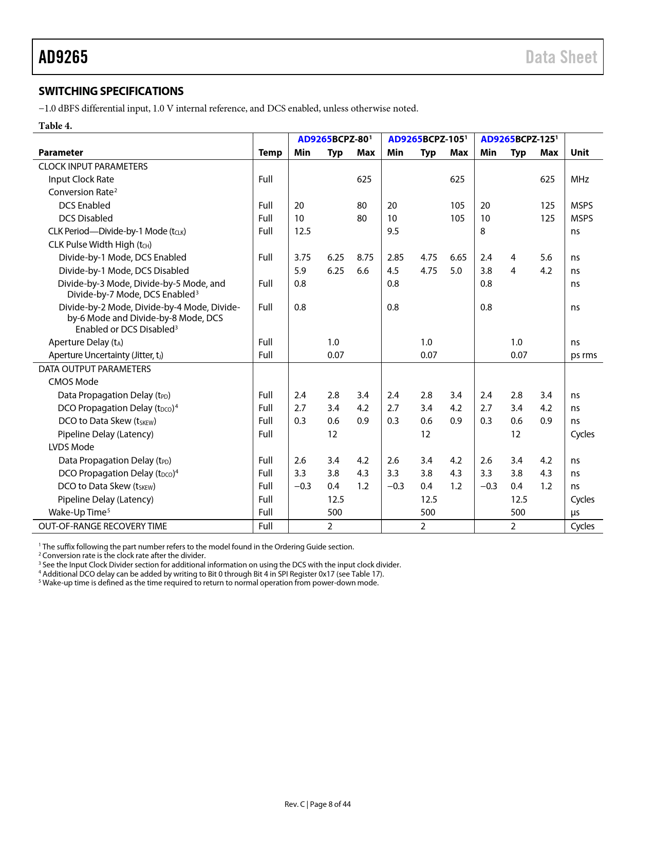 AD9265 Data Sheet SWITCHING SPECIFICATIONS Table 4 AD9265B CPZ-801 CPZ-1051 CPZ-1251 Parameter Temp Min Typ Max Min Max Unit
