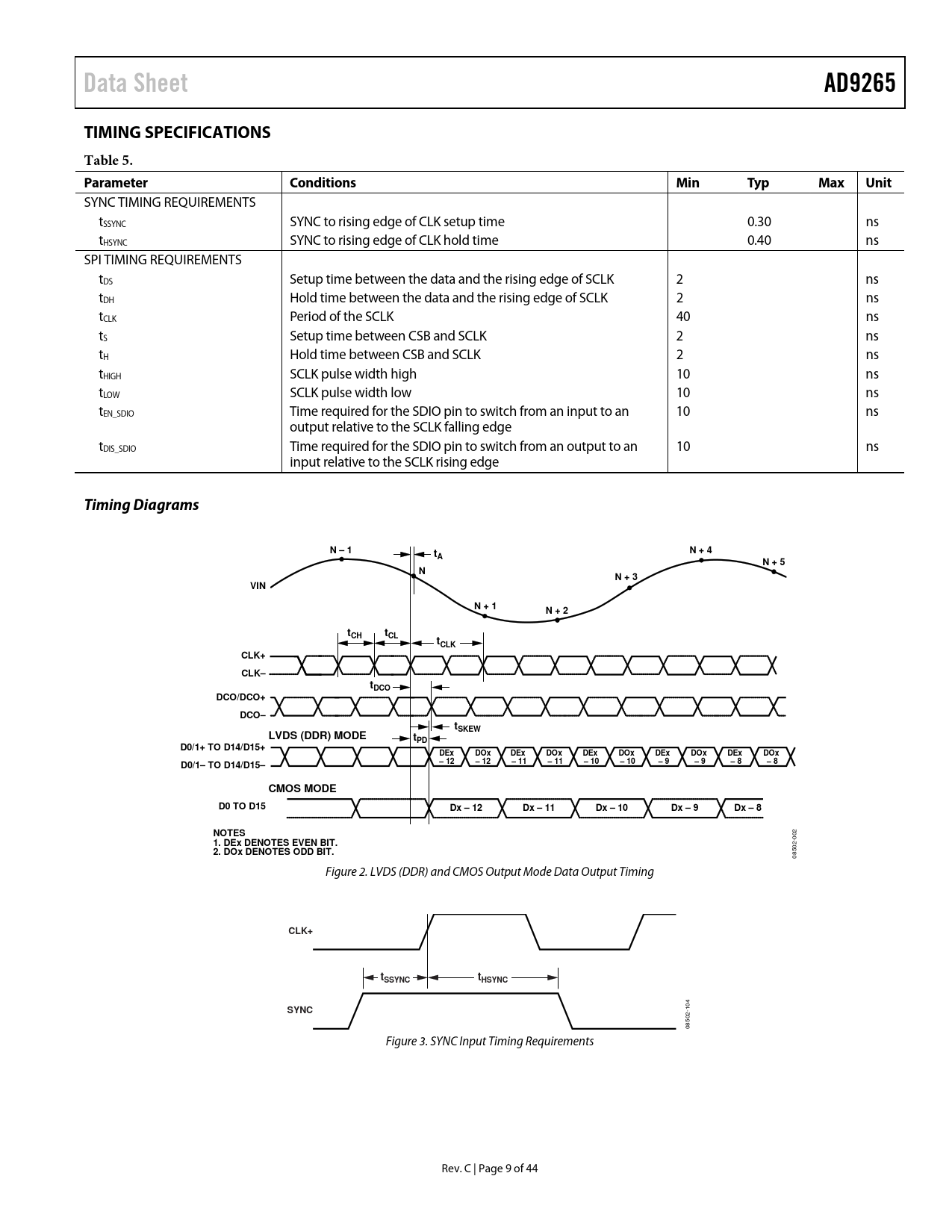 Data SheetAD9265TIMING SPECIFICATIONS Table 5. ParameterConditionsMinTypMaxUnit SYNC TIMING REQUIREMENTS tSSYNC SYNC to rising edge of CLK setup time 0.30 ns tHSYNC SYNC to rising edge of CLK hold time 0.40 ns SPI TIMING REQUIREMENTS tDS Setup time between the data and the rising edge of SCLK 2 ns tDH Hold time between the data and the rising edge of SCLK 2 ns tCLK Period of the SCLK 40 ns tS Setup time between CSB and SCLK 2 ns tH Hold time between CSB and SCLK 2 ns tHIGH SCLK pulse width high 10 ns tLOW SCLK pulse width low 10 ns tEN_SDIO Time required for the SDIO pin to switch from an input to an 10 ns output relative to the SCLK falling edge tDIS_SDIO Time required for the SDIO pin to switch from an output to an 10 ns input relative to the SCLK rising edge Timing DiagramsN – 1N + 4tAN + 5NN + 3VINN + 1N + 2tCHtCLtCLKCLK+CLK–tDCODCO/DCO+DCO–tSKEWLVDS (DDR) MODEtPDD0/1+ TO D14/D15+DExDOxDExDOxDExDOxDExDOxDExDOxD0/1– TO D14/D15–– 12– 12– 11– 11– 10– 10– 9– 9– 8– 8CMOS MODED0 TO D15Dx – 12Dx – 11Dx – 10Dx – 9Dx – 8NOTES 002 1. DEx DENOTES EVEN BIT. 2. DOx DENOTES ODD BIT. 08502- Figure 2. LVDS (DDR) and CMOS Output Mode Data Output Timing CLK+ttSSYNCHSYNCSYNC 104 08502- Figure 3. SYNC Input Timing Requirements Rev. C | Page 9 of 44 Document Outline Features Applications Product Highlights Functional Block Diagram Table of Contents Revision History General Description Specifications ADC DC Specifications ADC AC Specifications Digital Specifications Switching Specifications Timing Specifications Timing Diagrams Absolute Maximum Ratings Thermal Characteristics ESD Caution Pin Configurations and Function Descriptions Typical Performance Characteristics Equivalent Circuits Theory of Operation ADC Architecture Analog Input Considerations Input Common Mode Dither Large Signal FFT Small Signal FFT Static Linearity Differential Input Configurations Voltage Reference Internal Reference Connection External Reference Operation Clock Input Considerations Clock Input Options Clock Duty Cycle Input Clock Divider Jitter Considerations Power Dissipation and Standby Mode Digital Outputs Digital Output Enable Function (OEB) Timing Data Clock Output (DCO) Built-In Self-Test (BIST) and Output Test Built-In Self-Test (BIST) Output Test Modes Serial Port Interface (SPI) Configuration Using the SPI Hardware Interface Configuration Without the SPI SPI Accessible Features Memory Map Reading the Memory Map Register Table Open Locations Default Values Logic Levels Transfer Register Map Memory Map Register Table Memory Map Register Descriptions Sync Control (Register 0x100) Applications Information Design Guidelines Power and Ground Recommendations LVDS Operation Exposed Paddle Thermal Heat Slug Recommendations VCM RBIAS Reference Decoupling SPI Port Outline Dimensions Ordering Guide