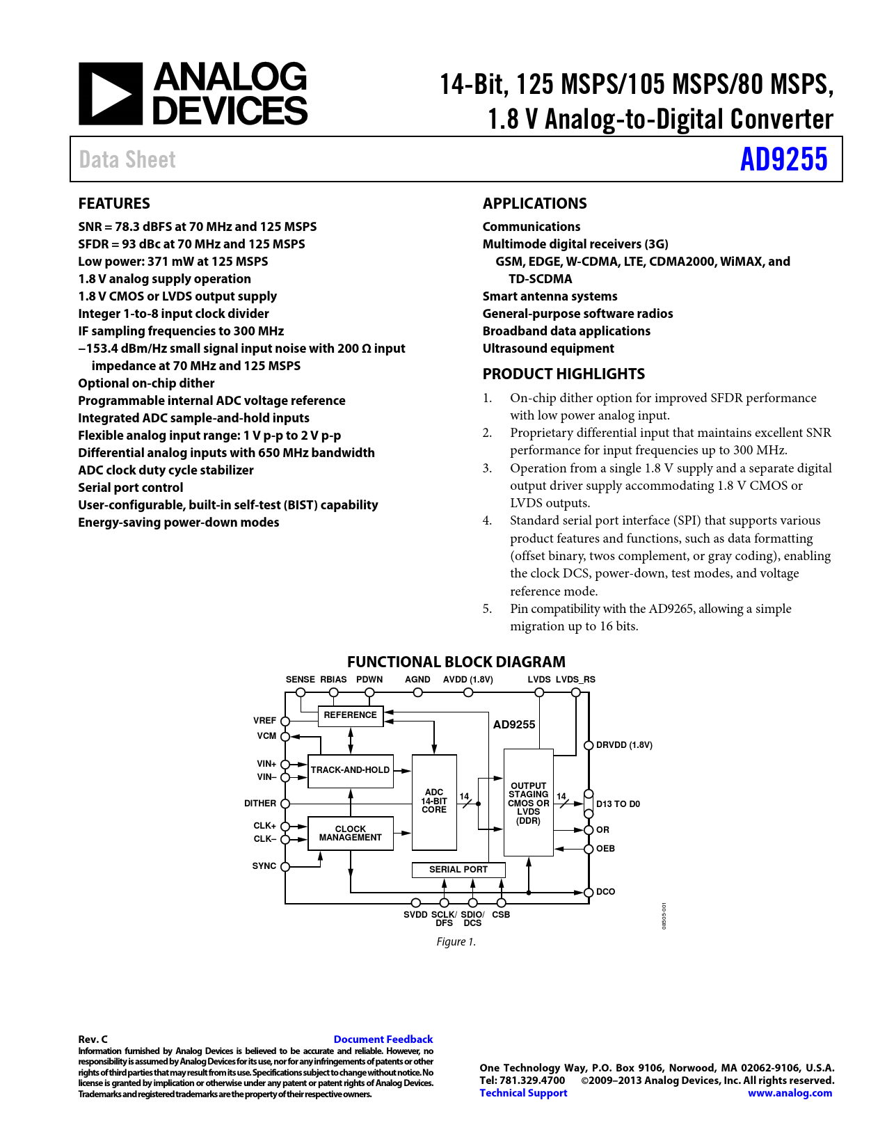 14-Bit, 125 MSPS/105 MSPS/80 MSPS,. 1.8 V Analog-to-Digital Converter. Data Sheet. AD9255. FEATURES. APPLICATIONS