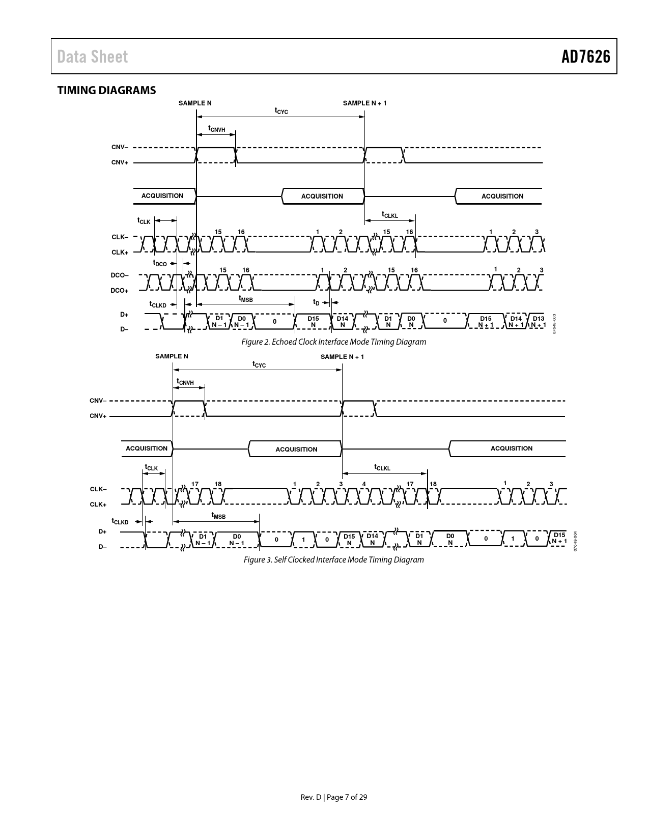 Data Sheet. AD7626. TIMING DIAGRAMS. SAMPLE N. SAMPLE N + 1. tCYC. tCNVH. CNV–. CNV+. ACQUISITION. tCLKL. tCLK. CLK–. CLK+. tDCO. DCO–. DCO+. tMSB. CLKD. D15