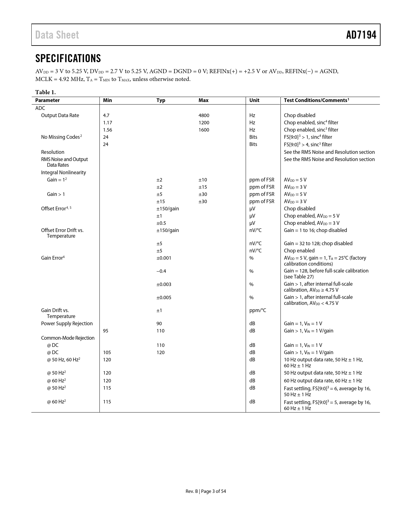 Data Sheet AD7194 SPECIFICATIONS Table 1 Parameter Min Typ Max Unit Test Conditions/Comments1