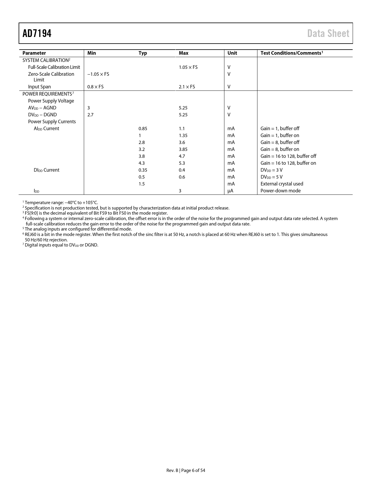AD7194Data SheetParameterMinTypMaxUnitTest Conditions/Comments1 SYSTEM CALIBRATION2 Full-Scale Calibration Limit 1.05 × FS V Zero-Scale Calibration −1.05 × FS V Limit Input Span 0.8 × FS 2.1 × FS V POWER REQUIREMENTS7 Power Supply Voltage AVDD − AGND 3 5.25 V DVDD − DGND 2.7 5.25 V Power Supply Currents AIDD Current 0.85 1.1 mA Gain = 1, buffer off 1 1.35 mA Gain = 1, buffer on 2.8 3.6 mA Gain = 8, buffer off 3.2 3.85 mA Gain = 8, buffer on 3.8 4.7 mA Gain = 16 to 128, buffer off 4.3 5.3 mA Gain = 16 to 128, buffer on DIDD Current 0.35 0.4 mA DVDD = 3 V 0.5 0.6 mA DVDD = 5 V 1.5 mA External crystal used IDD 3 µA Power-down mode 1 Temperature range: −40°C to +105°C. 2 Specification is not production tested, but is supported by characterization data at initial product release. 3 FS[9:0] is the decimal equivalent of Bit FS9 to Bit FS0 in the mode register. 4 Following a system or internal zero-scale calibration, the offset error is in the order of the noise for the programmed gain and output data rate selected. A system full-scale calibration reduces the gain error to the order of the noise for the programmed gain and output data rate. 5 The analog inputs are configured for differential mode. 6 REJ60 is a bit in the mode register. When the first notch of the sinc filter is at 50 Hz, a notch is placed at 60 Hz when REJ60 is set to 1. This gives simultaneous 50 Hz/60 Hz rejection. 7 Digital inputs equal to DVDD or DGND. Rev. B | Page 6 of 54 Document Outline FEATURES APPLICATIONS GENERAL DESCRIPTION FUNCTIONAL BLOCK DIAGRAM TABLE OF CONTENTS REVISION HISTORY SPECIFICATIONS TIMING CHARACTERISTICS Circuit and Timing Diagrams ABSOLUTE MAXIMUM RATINGS THERMAL RESISTANCE ESD CAUTION PIN CONFIGURATION AND FUNCTION DESCRIPTIONS TYPICAL PERFORMANCE CHARACTERISTICS RMS NOISE AND RESOLUTION SINC4 CHOP DISABLED SINC3 CHOP DISABLED FAST SETTLING ON-CHIP REGISTERS COMMUNICATIONS REGISTER RS2, RS1, RS0 = 000 STATUS REGISTER RS2, RS1, RS0 = 000; Power-On/Reset = 0x80 MODE REGISTER RS2, RS1, RS0 = 001; Power-On/Reset = 0x080060 CONFIGURATION REGISTER RS2, RS1, RS0 = 010; Power-On/Reset = 0x000117 Channel Selection (Pseudo Bit = 0) DATA REGISTER RS2, RS1, RS0 = 011; Power-On/Reset = 0x000000 ID REGISTER RS2, RS1, RS0 = 100; Power-On/Reset = 0xX3 GPOCON REGISTER RS2, RS1, RS0 = 101; Power-On/Reset = 0x00 OFFSET REGISTER RS2, RS1, RS0 = 110; Power-On/Reset = 0x800000) FULL-SCALE REGISTER RS2, RS1, RS0 = 111; Power-On/Reset = 0x5XXXX0 ADC CIRCUIT INFORMATION OVERVIEW Analog Inputs Multiplexer PGA Reference Detect Burnout Currents Σ-Δ ADC and Filter Serial Interface Clock Temperature Sensor Digital Outputs Calibration ANALOG INPUT CHANNEL PROGRAMMABLE GAIN ARRAY (PGA) REFERENCE REFERENCE DETECT BIPOLAR/UNIPOLAR CONFIGURATION DATA OUTPUT CODING BURNOUT CURRENTS DIGITAL INTERFACE Single Conversion Mode Continuous Conversion Mode Continuous Read RESET SYSTEM SYNCHRONIZATION ENABLE PARITY CLOCK TEMPERATURE SENSOR LOGIC OUTPUTS CALIBRATION DIGITAL FILTER SINC4 FILTER (CHOP DISABLED) Sinc4 Output Data Rate/Settling Time Sinc4 Zero Latency Sinc4 50 Hz/60 Hz Rejection SINC3 FILTER (CHOP DISABLED) Sinc3 Output Data Rate and Settling Time Sinc3 Zero Latency Sinc3 50 Hz/60 Hz Rejection CHOP ENABLED (SINC4 FILTER) Output Data Rate and Settling Time (Sinc4 Chop Enabled) 50 Hz/60 Hz Rejection (Sinc4 Chop Enabled) CHOP ENABLED (SINC3 FILTER) Output Data Rate and Settling Time (Sinc3 Chop Enabled) 50 Hz/60 Hz Rejection (Sinc3 Chop Enabled) FAST SETTLING MODE (SINC4 FILTER) Output Data Rate and Settling Time, Sinc4 Filter 50 Hz/60 Hz Rejection, Sinc4 Filter FAST SETTLING MODE (SINC3 FILTER) Output Data Rate and Settling Time, Sinc3 Filter 50 Hz/60 Hz Rejection, Sinc3 Filter FAST SETTLING MODE (CHOP ENABLED) SUMMARY OF FILTER OPTIONS GROUNDING AND LAYOUT APPLICATIONS INFORMATION FLOWMETER OUTLINE DIMENSIONS ORDERING GUIDE