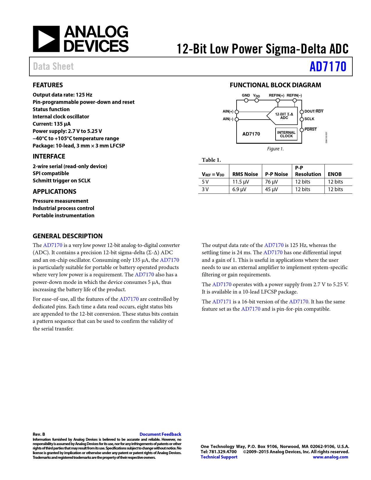12-Bit Low Power Sigma-Delta ADC. Data Sheet. AD7170. FEATURES. FUNCTIONAL BLOCK DIAGRAM. Output data rate: 125 Hz. GND VDD