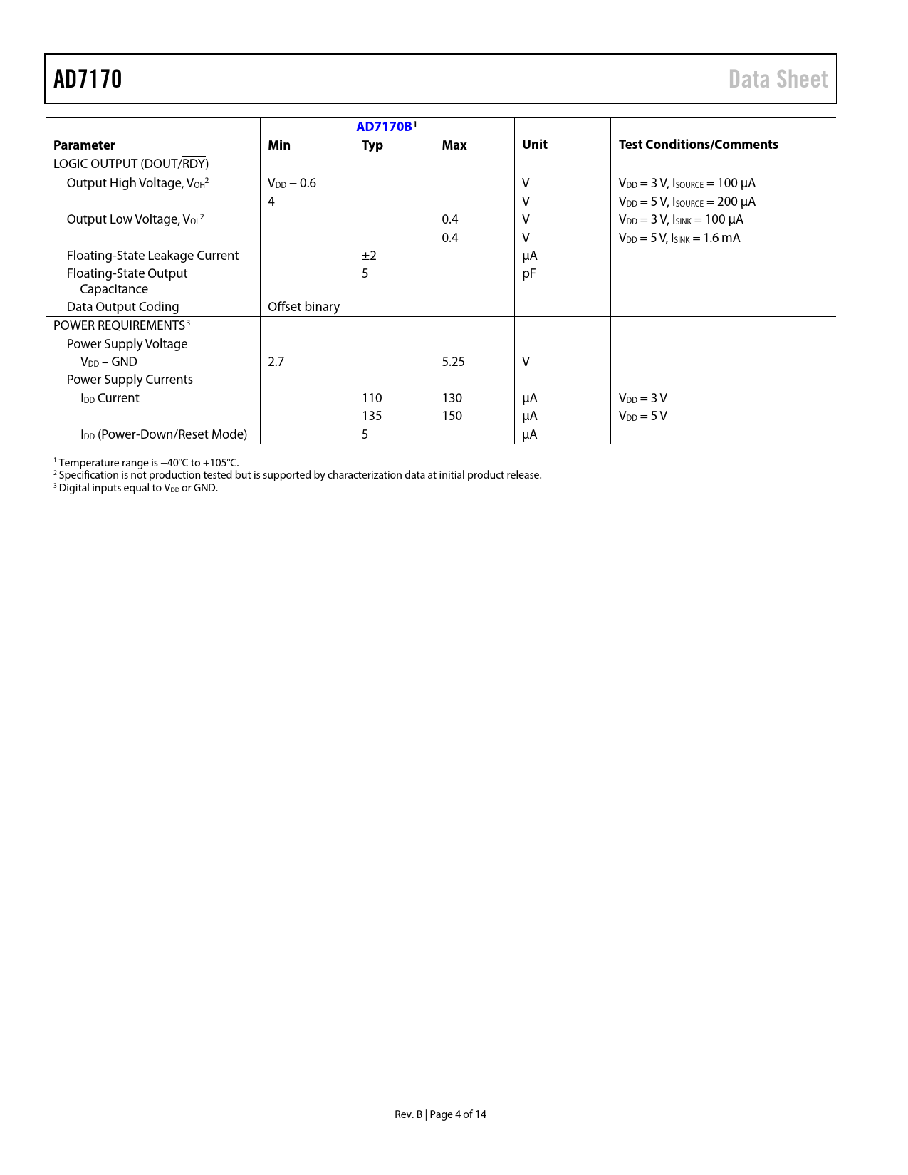 AD7170. Data Sheet. AD7170B1. Parameter. Min. Typ. Max. Unit. Test Conditions/Comments