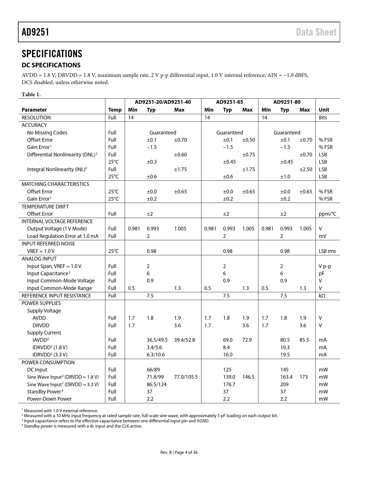 AD9251. Data Sheet. SPECIFICATIONS DC SPECIFICATIONS. Table 1. AD9251-20/AD9251-40. AD9251-65. AD9251-80. Parameter. Temp Min. Typ. Max. Min