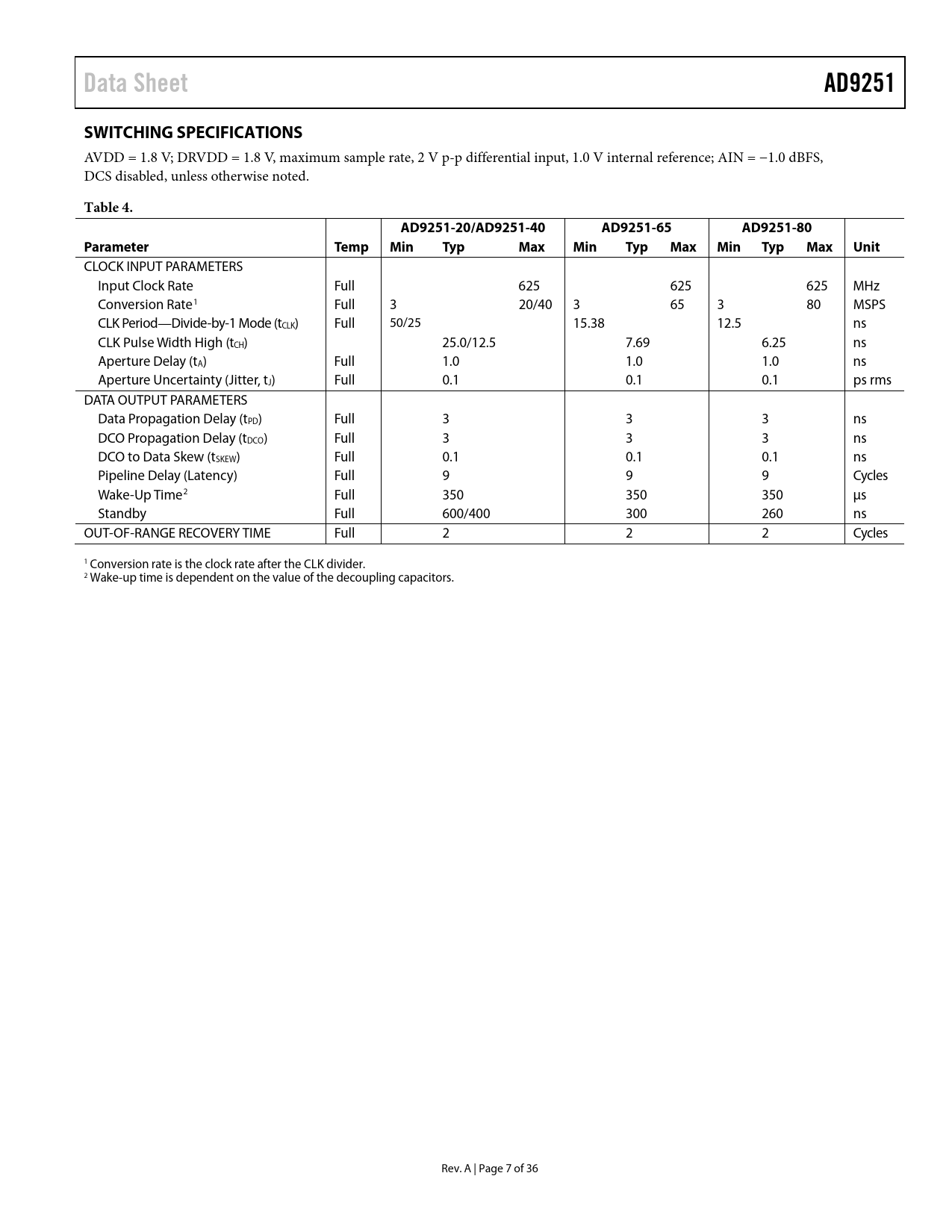 Seiten / Seite37 / 8 — Data Sheet. AD9251. SWITCHING SPECIFICATIONS. Table 4. …