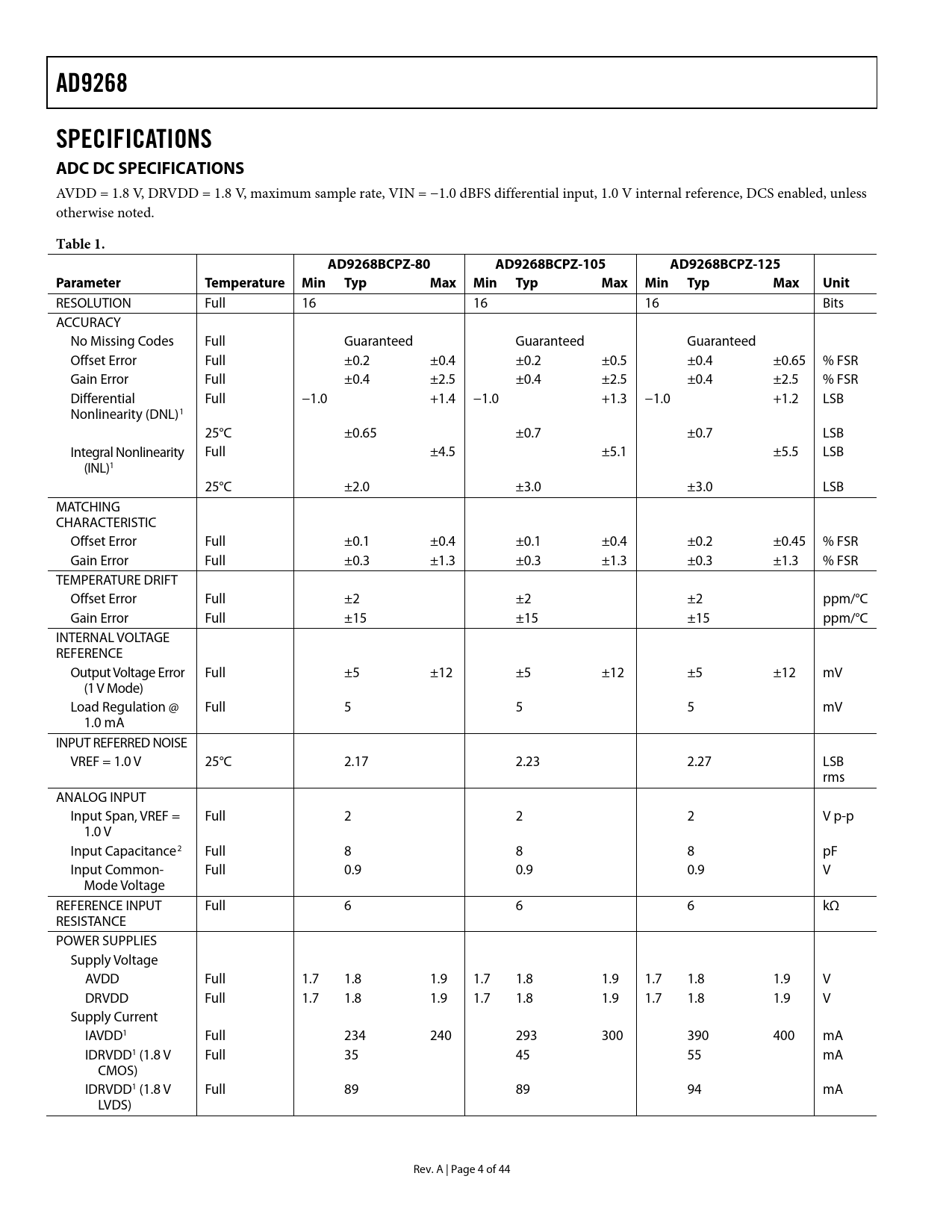 AD9268. SPECIFICATIONS ADC DC SPECIFICATIONS. Table 1. AD9268BCPZ-80. AD9268BCPZ-105. AD9268BCPZ-125. Parameter. Temperature Min Typ