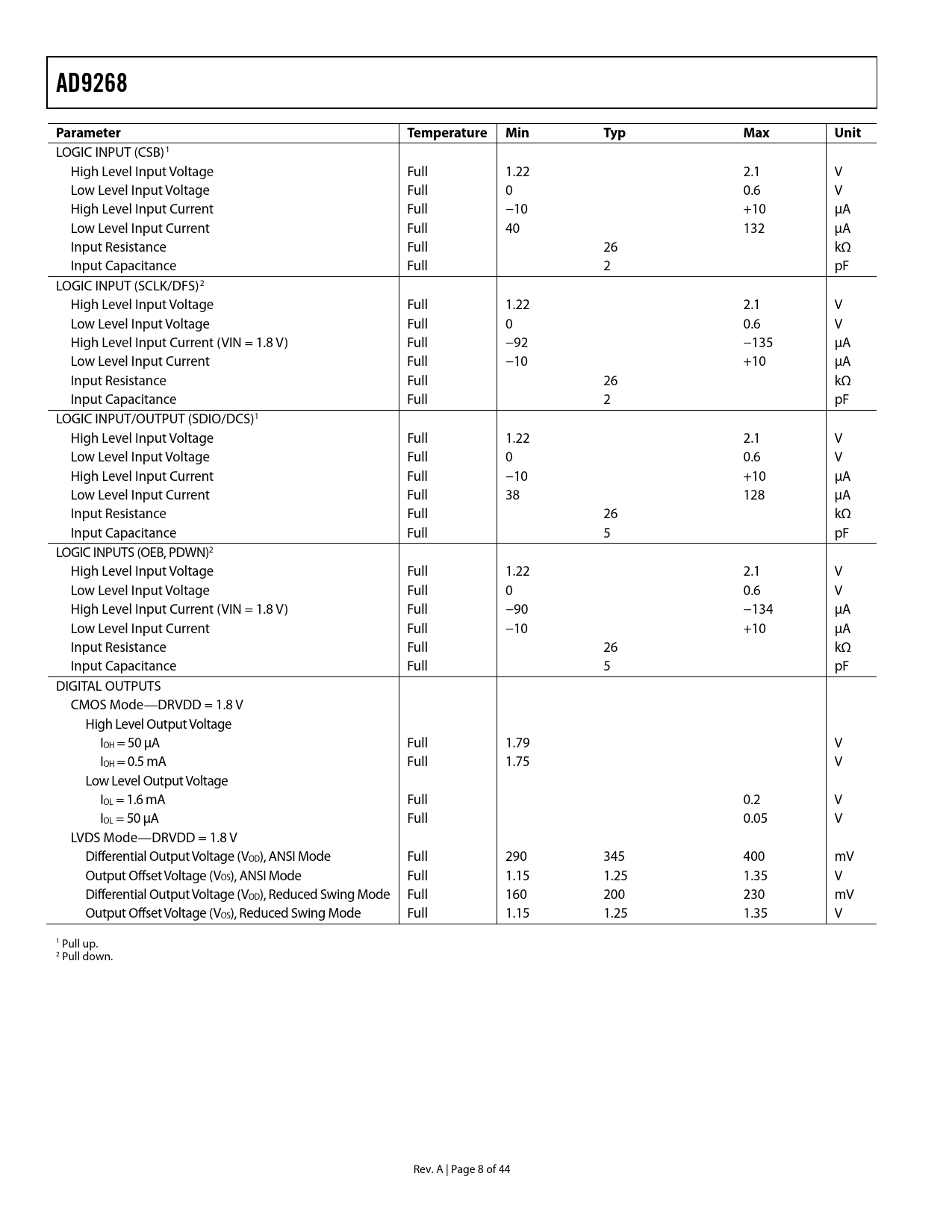 LOGIC INPUT (CSB)1 High Level Input Voltage Full 1.22 2.1 V Low Level Input Voltage Full 0 0.6 V High Level Input Current Full −10 +10 μA Low Level Input Current Full 40 132 μA Input Resistance Full 26 kΩ Input Capacitance Full 2 pF LOGIC INPUT (SCLK/DFS)2 High Level Input Voltage Full 1.22 2.1 V Low Level Input Voltage Full 0 0.6 V High Level Input Current (VIN = 1.8 V) Full −92 −135 μA Low Level Input Current Full −10 +10 μA Input Resistance Full 26 kΩ Input Capacitance Full 2 pF LOGIC INPUT/OUTPUT (SDIO/DCS)1 High Level Input Voltage Full 1.22 2.1 V Low Level Input Voltage Full 0 0.6 V High Level Input Current Full −10 +10 μA Low Level Input Current Full 38 128 μA Input Resistance Full 26 kΩ Input Capacitance Full 5 pF LOGIC INPUTS (OEB, PDWN)2 High Level Input Voltage Full 1.22 2.1 V Low Level Input Voltage Full 0 0.6 V High Level Input Current (VIN = 1.8 V) Full −90 −134 μA Low Level Input Current Full −10 +10 μA Input Resistance Full 26 kΩ Input Capacitance Full 5 pF DIGITAL OUTPUTS CMOS Mode—DRVDD = 1.8 V High Level Output Voltage IOH = 50 μA Full 1.79 V IOH = 0.5 mA Full 1.75 V Low Level Output Voltage IOL = 1.6 mA Full 0.2 V IOL = 50 μA Full 0.05 V LVDS Mode—DRVDD = 1.8 V Differential Output Voltage (VOD), ANSI Mode Full 290 345 400 mV Output Offset Voltage (VOS), ANSI Mode Full 1.15 1.25 1.35 V Differential Output Voltage (VOD), Reduced Swing Mode Full 160 200 230 mV Output Offset Voltage (VOS), Reduced Swing Mode Full 1.15 1.25 1.35 V 1 Pull up. 2 Pull down. Rev. A | Page 8 of 44 Document Outline FEATURES APPLICATIONS FUNCTIONAL BLOCK DIAGRAM PRODUCT HIGHLIGHTS TABLE OF CONTENTS REVISION HISTORY GENERAL DESCRIPTION SPECIFICATIONS ADC DC SPECIFICATIONS ADC AC SPECIFICATIONS DIGITAL SPECIFICATIONS SWITCHING SPECIFICATIONS TIMING SPECIFICATIONS Timing Diagrams ABSOLUTE MAXIMUM RATINGS THERMAL CHARACTERISTICS ESD CAUTION PIN CONFIGURATIONS AND FUNCTION DESCRIPTIONS TYPICAL PERFORMANCE CHARACTERISTICS EQUIVALENT CIRCUITS THEORY OF OPERATION ADC ARCHITECTURE ANALOG INPUT CONSIDERATIONS Input Common Mode Common-Mode Voltage Servo Dither Differential Input Configurations VOLTAGE REFERENCE Internal Reference Connection External Reference Operation CLOCK INPUT CONSIDERATIONS Clock Input Options Input Clock Divider Clock Duty Cycle Jitter Considerations CHANNEL/CHIP SYNCHRONIZATION POWER DISSIPATION AND STANDBY MODE DIGITAL OUTPUTS Digital Output Enable Function (OEB) TIMING Data Clock Output (DCO) BUILT-IN SELF-TEST (BIST) AND OUTPUT TEST BUILT-IN SELF-TEST (BIST) OUTPUT TEST MODES SERIAL PORT INTERFACE (SPI) CONFIGURATION USING THE SPI HARDWARE INTERFACE CONFIGURATION WITHOUT THE SPI SPI ACCESSIBLE FEATURES MEMORY MAP READING THE MEMORY MAP REGISTER TABLE Open Locations Default Values Logic Levels Transfer Register Map Channel-Specific Registers MEMORY MAP REGISTER TABLE MEMORY MAP REGISTER DESCRIPTIONS Sync Control (Register 0x100) Bits[7:3]—Reserved Bit 2—Clock Divider Next Sync Only Bit 1—Clock Divider Sync Enable Bit 0—Master Sync Enable APPLICATIONS INFORMATION DESIGN GUIDELINES Power and Ground Recommendations LVDS Operation Exposed Paddle Thermal Heat Slug Recommendations VCM RBIAS Reference Decoupling SPI Port OUTLINE DIMENSIONS ORDERING GUIDE