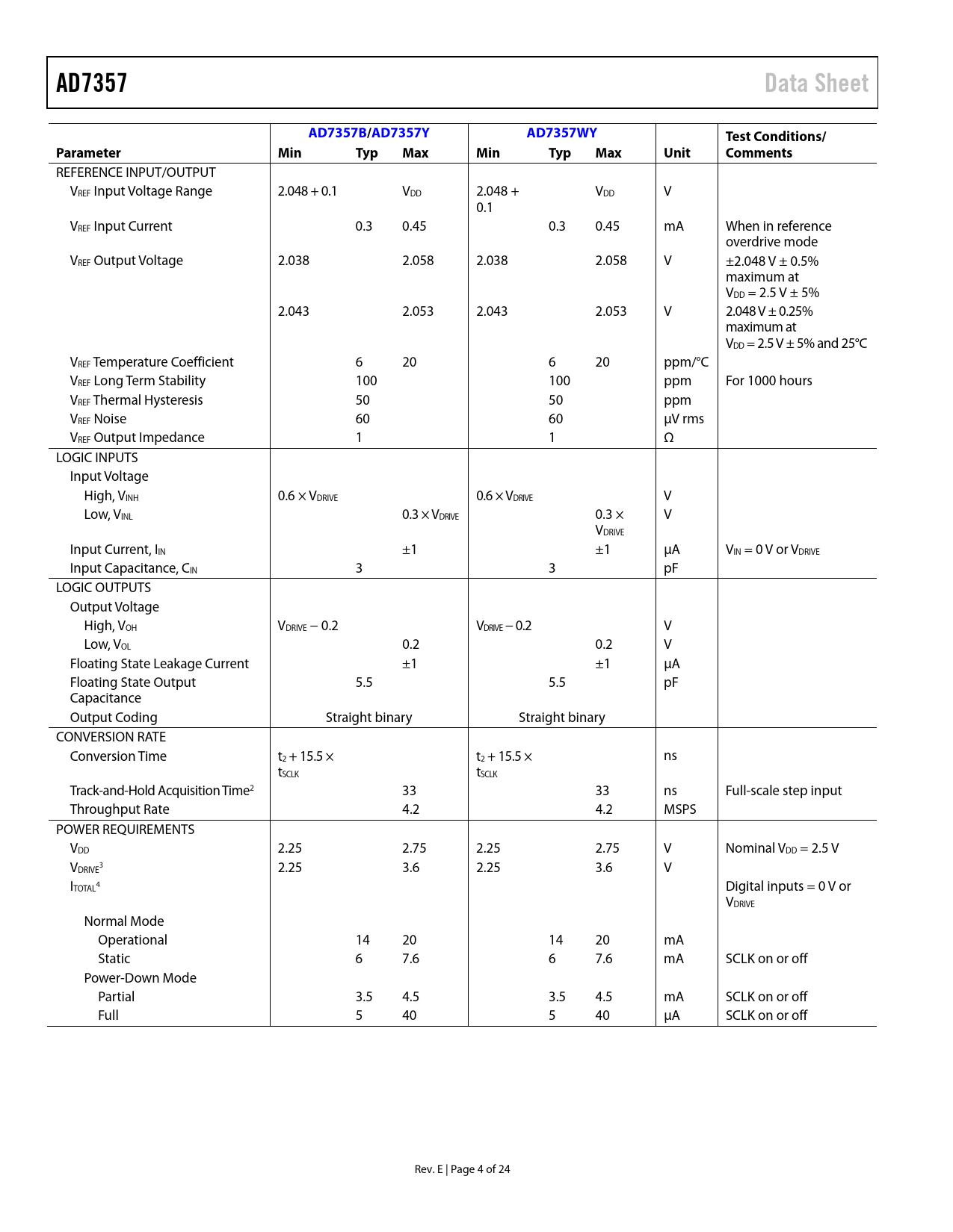 AD7357 Data Sheet AD7357B/AD7357Y AD7357WY Test Conditions/ Parameter Min Typ Max Min Typ Max Unit Comments