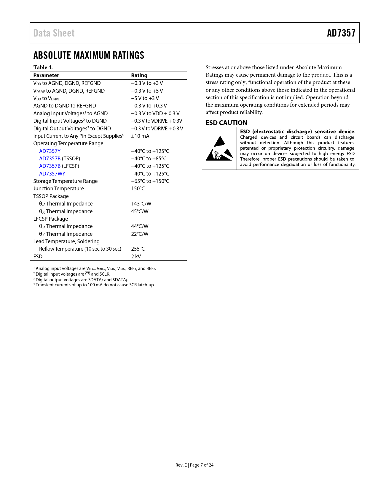 Data SheetAD7357ABSOLUTE MAXIMUM RATINGS Table 4. Stresses at or above those listed under Absolute Maximum Parameter Rating Ratings may cause permanent damage to the product. This is a V stress rating only; functional operation of the product at these DD to AGND, DGND, REFGND −0.3 V to +3 V V or any other conditions above those indicated in the operational DRIVE to AGND, DGND, REFGND −0.3 V to +5 V V section of this specification is not implied. Operation beyond DD to VDRIVE −5 V to +3 V AGND to DGND to REFGND −0.3 V to +0.3 V the maximum operating conditions for extended periods may Analog Input Voltages1 to AGND −0.3 V to VDD + 0.3 V affect product reliability. Digital Input Voltages2 to DGND −0.3 V to VDRIVE + 0.3V ESD CAUTION Digital Output Voltages3 to DGND −0.3 V to VDRIVE + 0.3 V Input Current to Any Pin Except Supplies4 ±10 mA Operating Temperature Range AD7357Y −40°C to +125°C AD7357B (TSSOP) −40°C to +85°C AD7357B (LFCSP) −40°C to +125°C AD7357WY −40°C to +125°C Storage Temperature Range −65°C to +150°C Junction Temperature 150°C TSSOP Package θJA Thermal Impedance 143°C/W θJC Thermal Impedance 45°C/W LFCSP Package θJA Thermal Impedance 44°C/W θJC Thermal Impedance 22°C/W Lead Temperature, Soldering Reflow Temperature (10 sec to 30 sec) 255°C ESD 2 kV 1 Analog input voltages are VINA+, VINA−, VINB+, VINB−, REFA, and REFB. 2 Digital input voltages are CS and SCLK. 3 Digital output voltages are SDATAA and SDATAB. 4 Transient currents of up to 100 mA do not cause SCR latch-up. Rev. E | Page 7 of 24 Document Outline FEATURES APPLICATIONS FUNCTIONAL BLOCK DIAGRAM GENERAL DESCRIPTION PRODUCT HIGHLIGHTS REVISION HISTORY SPECIFICATIONS TIMING SPECIFICATIONS ABSOLUTE MAXIMUM RATINGS ESD CAUTION PIN CONFIGURATIONS AND FUNCTION DESCRIPTIONS TYPICAL PERFORMANCE CHARACTERISTICS TERMINOLOGY THEORY OF OPERATION CIRCUIT INFORMATION CONVERTER OPERATION ANALOG INPUT STRUCTURE ANALOG INPUTS DRIVING DIFFERENTIAL INPUTS Differential Amplifier Operational Amplifier Pair VOLTAGE REFERENCE ADC TRANSFER FUNCTION MODES OF OPERATION NORMAL MODE PARTIAL POWER-DOWN MODE FULL POWER-DOWN MODE POWER-UP TIMES POWER vs. THROUGHPUT RATE SERIAL INTERFACE APPLICATION SUGGESTIONS GROUNDING AND LAYOUT EVALUATING THE AD7357 PERFORMANCE OUTLINE DIMENSIONS ORDERING GUIDE AUTOMOTIVE PRODUCTS