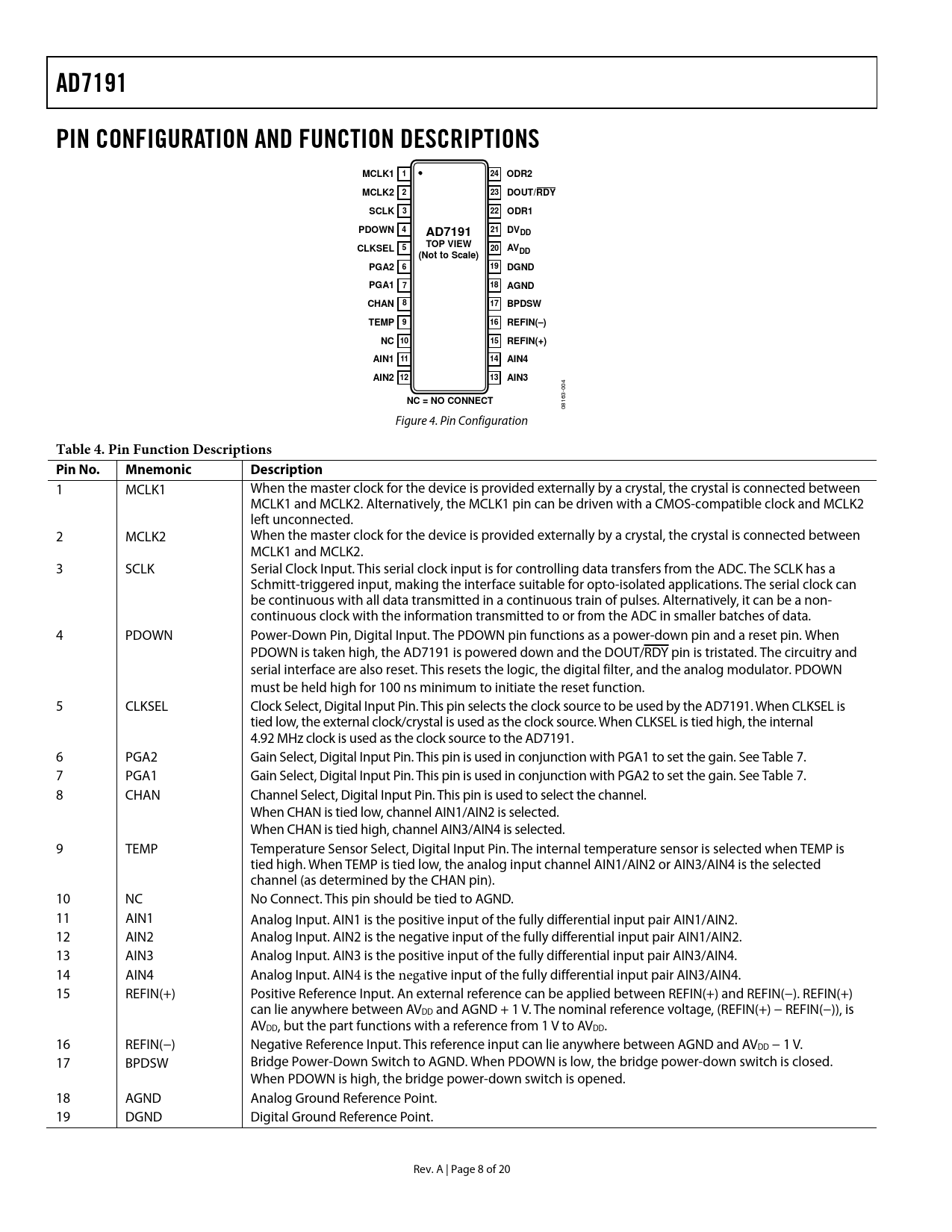 link to page 16 link to page 16 AD7191PIN CONFIGURATION AND FUNCTION DESCRIPTIONSMCLK1 124ODR2MCLK2 223DOUT/RDYSCLK 322ODR1PDOWN 421DVAD7191DDTOP VIEWCLKSEL 520AVDD(Not to Scale)PGA2 619DGNDPGA1 718AGND8CHAN17BPDSWTEMP 916REFIN(–)NC 1015REFIN(+)AIN1 1114AIN4AIN2 1213AIN3 04 0 3- NC = NO CONNECT 16 08 Figure 4. Pin Configuration Table 4. Pin Function Descriptions Pin No.MnemonicDescription 1 MCLK1 When the master clock for the device is provided externally by a crystal, the crystal is connected between MCLK1 and MCLK2. Alternatively, the MCLK1 pin can be driven with a CMOS-compatible clock and MCLK2 left unconnected. 2 MCLK2 When the master clock for the device is provided externally by a crystal, the crystal is connected between MCLK1 and MCLK2. 3 SCLK Serial Clock Input. This serial clock input is for controlling data transfers from the ADC. The SCLK has a Schmitt-triggered input, making the interface suitable for opto-isolated applications. The serial clock can be continuous with all data transmitted in a continuous train of pulses. Alternatively, it can be a non- continuous clock with the information transmitted to or from the ADC in smaller batches of data. 4 PDOWN Power-Down Pin, Digital Input. The PDOWN pin functions as a power-down pin and a reset pin. When PDOWN is taken high, the AD7191 is powered down and the DOUT/RDY pin is tristated. The circuitry and serial interface are also reset. This resets the logic, the digital filter, and the analog modulator. PDOWN must be held high for 100 ns minimum to initiate the reset function. 5 CLKSEL Clock Select, Digital Input Pin. This pin selects the clock source to be used by the AD7191. When CLKSEL is tied low, the external clock/crystal is used as the clock source. When CLKSEL is tied high, the internal 4.92 MHz clock is used as the clock source to the AD7191. 6 PGA2 Gain Select, Digital Input Pin. This pin is used in conjunction with PGA1 to set the gain. See Table 7. 7 PGA1 Gain Select, Digital Input Pin. This pin is used in conjunction with PGA2 to set the gain. See Table 7. 8 CHAN Channel Select, Digital Input Pin. This pin is used to select the channel. When CHAN is tied low, channel AIN1/AIN2 is selected. When CHAN is tied high, channel AIN3/AIN4 is selected. 9 TEMP Temperature Sensor Select, Digital Input Pin. The internal temperature sensor is selected when TEMP is tied high. When TEMP is tied low, the analog input channel AIN1/AIN2 or AIN3/AIN4 is the selected channel (as determined by the CHAN pin). 10 NC No Connect. This pin should be tied to AGND. 11 AIN1 Analog Input. AIN1 is the positive input of the fully differential input pair AIN1/AIN2. 12 AIN2 Analog Input. AIN2 is the negative input of the fully differential input pair AIN1/AIN2. 13 AIN3 Analog Input. AIN3 is the positive input of the fully differential input pair AIN3/AIN4. 14 AIN4 Analog Input. AIN4 is the negative input of the fully differential input pair AIN3/AIN4. 15 REFIN(+) Positive Reference Input. An external reference can be applied between REFIN(+) and REFIN(−). REFIN(+) can lie anywhere between AVDD and AGND + 1 V. The nominal reference voltage, (REFIN(+) − REFIN(−)), is AVDD, but the part functions with a reference from 1 V to AVDD. 16 REFIN(−) Negative Reference Input. This reference input can lie anywhere between AGND and AVDD − 1 V. 17 BPDSW Bridge Power-Down Switch to AGND. When PDOWN is low, the bridge power-down switch is closed. When PDOWN is high, the bridge power-down switch is opened. 18 AGND Analog Ground Reference Point. 19 DGND Digital Ground Reference Point. Rev. A | Page 8 of 20 Document Outline FEATURES INTERFACE APPLICATIONS GENERAL DESCRIPTION FUNCTIONAL BLOCK DIAGRAM TABLE OF CONTENTS REVISION HISTORY SPECIFICATIONS TIMING CHARACTERISTICS TIMING DIAGRAM ABSOLUTE MAXIMUM RATINGS ESD CAUTION PIN CONFIGURATION AND FUNCTION DESCRIPTIONS TYPICAL PERFORMANCE CHARACTERISTICS RMS NOISE AND RESOLUTION SPECIFICATIONS ADC CIRCUIT INFORMATION OVERVIEW FILTER, DATA RATE, AND SETTLING TIME GAIN ANALOG INPUT CHANNELS TEMPERATURE SENSOR POWER-DOWN (PDOWN) CLOCK BIPOLAR CONFIGURATION DATA OUTPUT CODING BRIDGE POWER-DOWN SWITCH REFERENCE DIGITAL INTERFACE GROUNDING AND LAYOUT APPLICATIONS INFORMATION WEIGH SCALES EMI RECOMMENDATIONS OUTLINE DIMENSIONS ORDERING GUIDE