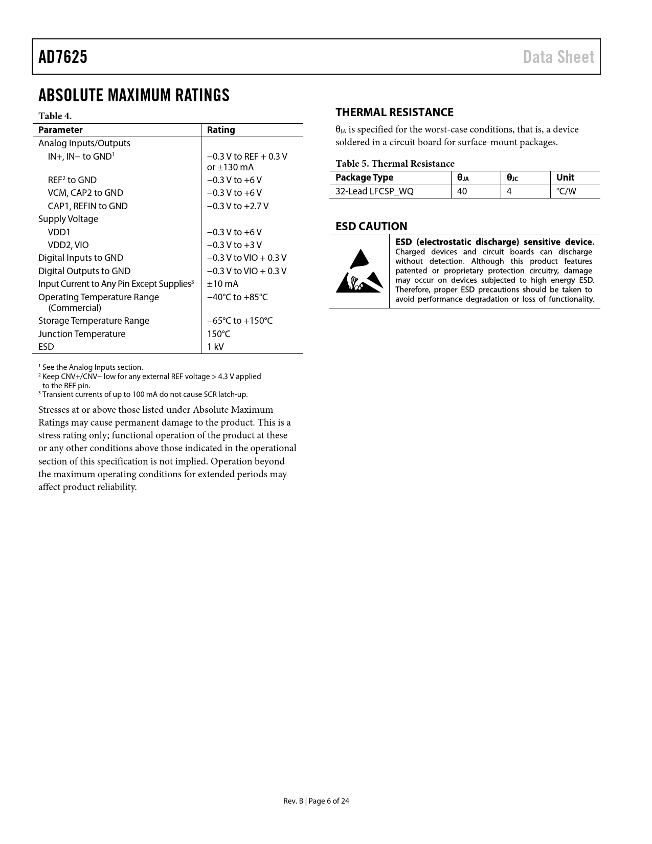 AD7625 Data Sheet ABSOLUTE MAXIMUM RATINGS Table 4 THERMAL RESISTANCE Parameter Rating Table 5 Thermal Resistance