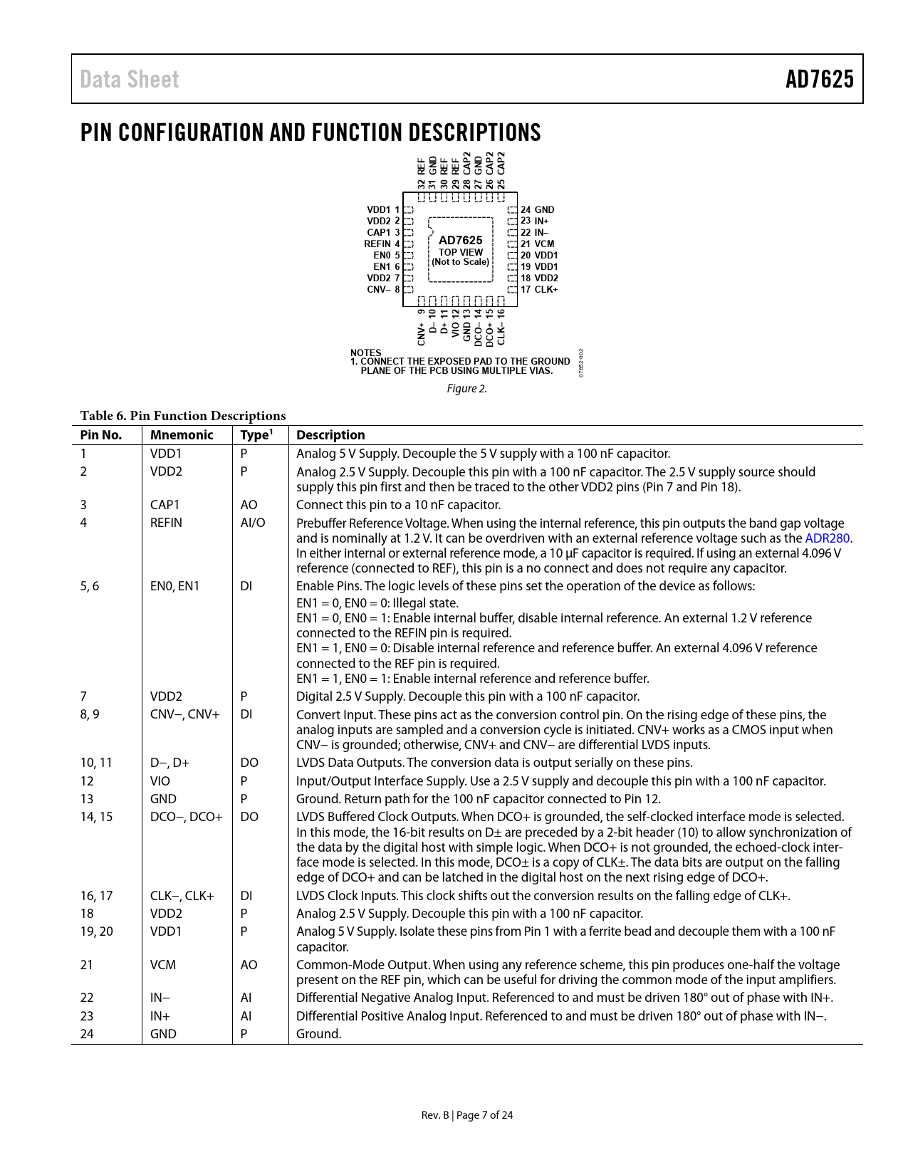 Data Sheet AD7625 PIN CONFIGURATION AND FUNCTION DESCRIPTIONS CAP VDD1 1 24 GND VDD2 2 23 IN+ CAP1 3 22 IN– REFIN 4 21 VCM TOP VIEW