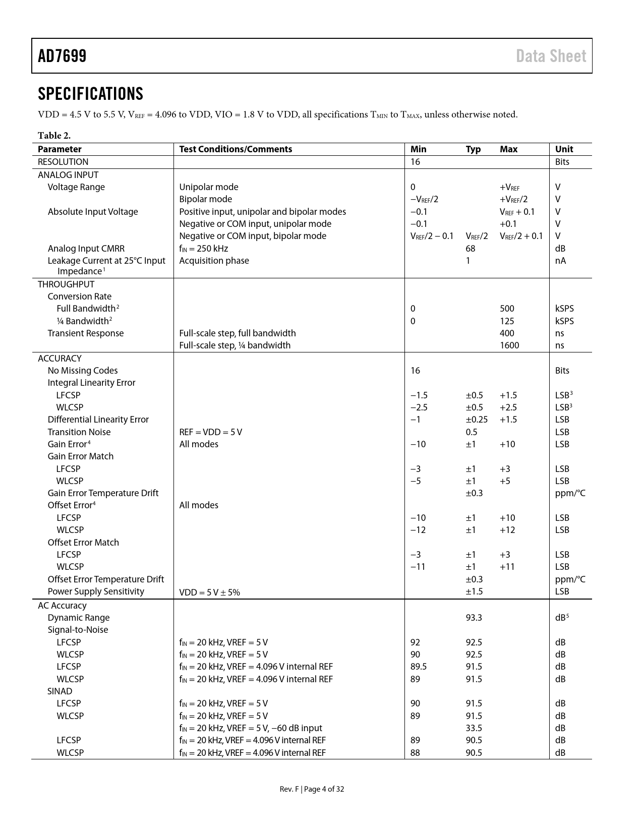 AD7699. Data Sheet. SPECIFICATIONS. Table 2. Parameter. Test Conditions/Comments. Min. Typ. Max. Unit