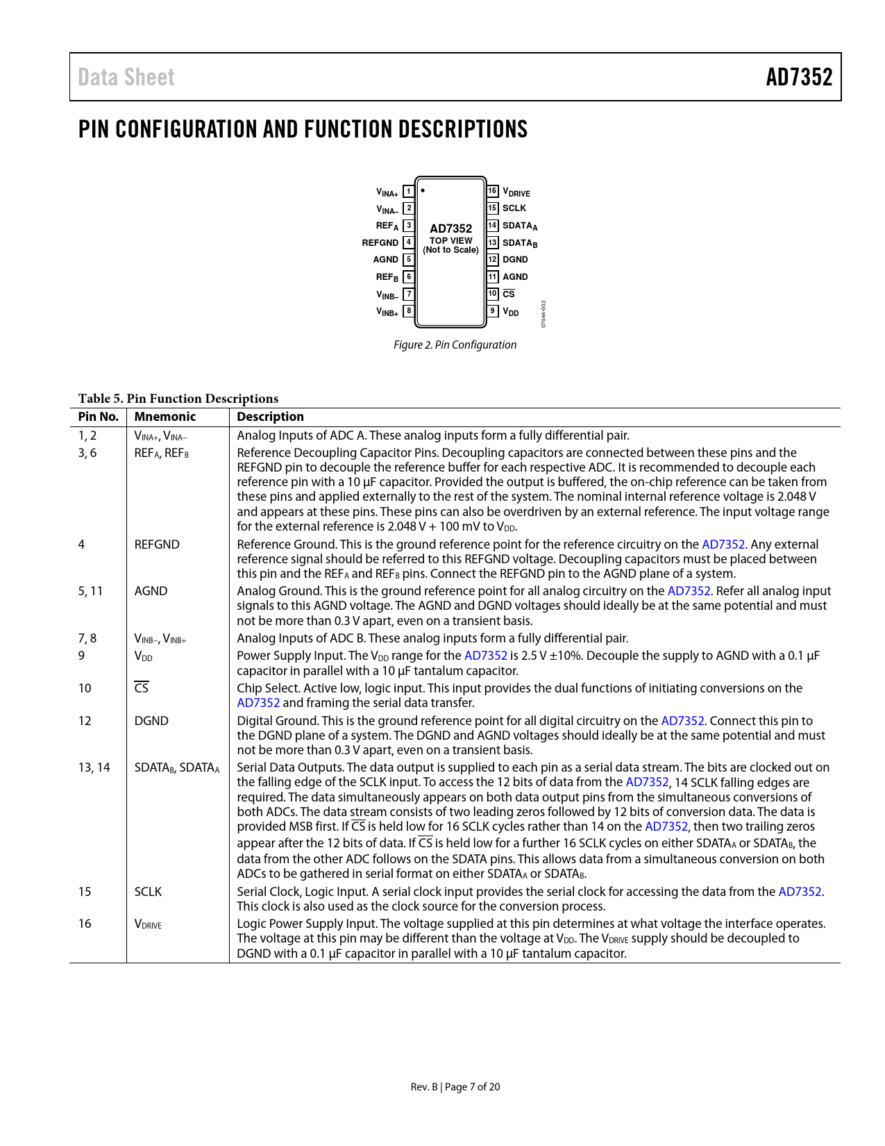 1, 2 VINA+, VINA− Analog Inputs of ADC A. These analog inputs form a fully differential pair. 3, 6 REFA, REFB Reference Decoupling Capacitor Pins. Decoupling capacitors are connected between these pins and the REFGND pin to decouple the reference buffer for each respective ADC. It is recommended to decouple each reference pin with a 10 μF capacitor. Provided the output is buffered, the on-chip reference can be taken from these pins and applied externally to the rest of the system. The nominal internal reference voltage is 2.048 V and appears at these pins. These pins can also be overdriven by an external reference. The input voltage range for the external reference is 2.048 V + 100 mV to VDD. 4 REFGND Reference Ground. This is the ground reference point for the reference circuitry on the AD7352. Any external reference signal should be referred to this REFGND voltage. Decoupling capacitors must be placed between this pin and the REFA and REFB pins. Connect the REFGND pin to the AGND plane of a system. 5, 11 AGND Analog Ground. This is the ground reference point for all analog circuitry on the AD7352. Refer all analog input signals to this AGND voltage. The AGND and DGND voltages should ideally be at the same potential and must not be more than 0.3 V apart, even on a transient basis. 7, 8 VINB−, VINB+ Analog Inputs of ADC B. These analog inputs form a fully differential pair. 9 VDD Power Supply Input. The VDD range for the AD7352 is 2.5 V ±10%. Decouple the supply to AGND with a 0.1 µF capacitor in parallel with a 10 µF tantalum capacitor. 10 CS Chip Select. Active low, logic input. This input provides the dual functions of initiating conversions on the AD7352 and framing the serial data transfer. 12 DGND Digital Ground. This is the ground reference point for all digital circuitry on the AD7352. Connect this pin to the DGND plane of a system. The DGND and AGND voltages should ideally be at the same potential and must not be more than 0.3 V apart, even on a transient basis. 13, 14 SDATAB, SDATAA Serial Data Outputs. The data output is supplied to each pin as a serial data stream. The bits are clocked out on the falling edge of the SCLK input. To access the 12 bits of data from the AD7352, 14 SCLK falling edges are required. The data simultaneously appears on both data output pins from the simultaneous conversions of both ADCs. The data stream consists of two leading zeros followed by 12 bits of conversion data. The data is provided MSB first. If CS is held low for 16 SCLK cycles rather than 14 on the AD7352, then two trailing zeros appear after the 12 bits of data. If CS is held low for a further 16 SCLK cycles on either SDATAA or SDATAB, the data from the other ADC follows on the SDATA pins. This allows data from a simultaneous conversion on both ADCs to be gathered in serial format on either SDATAA or SDATAB. 15 SCLK Serial Clock, Logic Input. A serial clock input provides the serial clock for accessing the data from the AD7352. This clock is also used as the clock source for the conversion process. 16 VDRIVE Logic Power Supply Input. The voltage supplied at this pin determines at what voltage the interface operates. The voltage at this pin may be different than the voltage at VDD. The VDRIVE supply should be decoupled to DGND with a 0.1 µF capacitor in parallel with a 10 µF tantalum capacitor. Rev. B | Page 7 of 20 Document Outline Features Applications Functional Block Diagram General Description Product Highlights Table of Contents Revision History Specifications Timing Specifications Absolute Maximum Ratings ESD Caution Pin Configuration and Function Descriptions Typical Performance Characteristics Terminology Theory of Operation Circuit Information Converter Operation Analog Input Structure Analog Inputs Driving Differential Inputs Differential Amplifier Op Amp Pair Voltage Reference ADC Transfer Function Modes of Operation Normal Mode Partial Power-Down Mode Full Power-Down Mode Power-Up Times Power vs. Throughput Rate Serial Interface Application Hints Grounding and Layout Evaluating the AD7352 Performance Outline Dimensions Ordering Guide