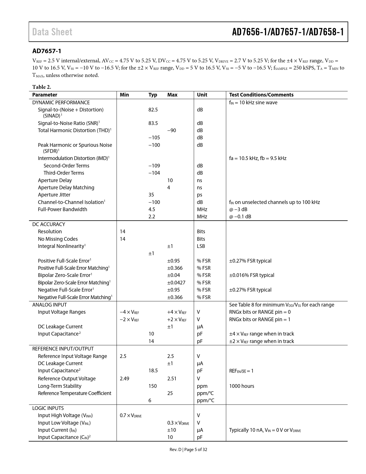 Data Sheet. AD7656-1/AD7657-1/AD7658-1. AD7657-1. Table 2. Parameter. Min. Typ. Max. Unit. Test Conditions/Comments