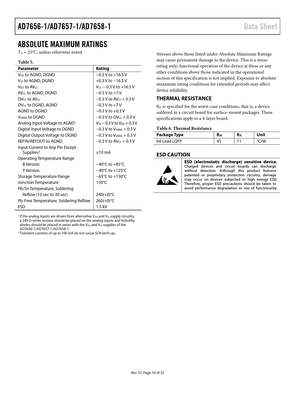 AD7656-1/AD7657-1/AD7658-1. Data Sheet. ABSOLUTE MAXIMUM RATINGS. Table 5. Parameter. Rating. THERMAL RESISTANCE
