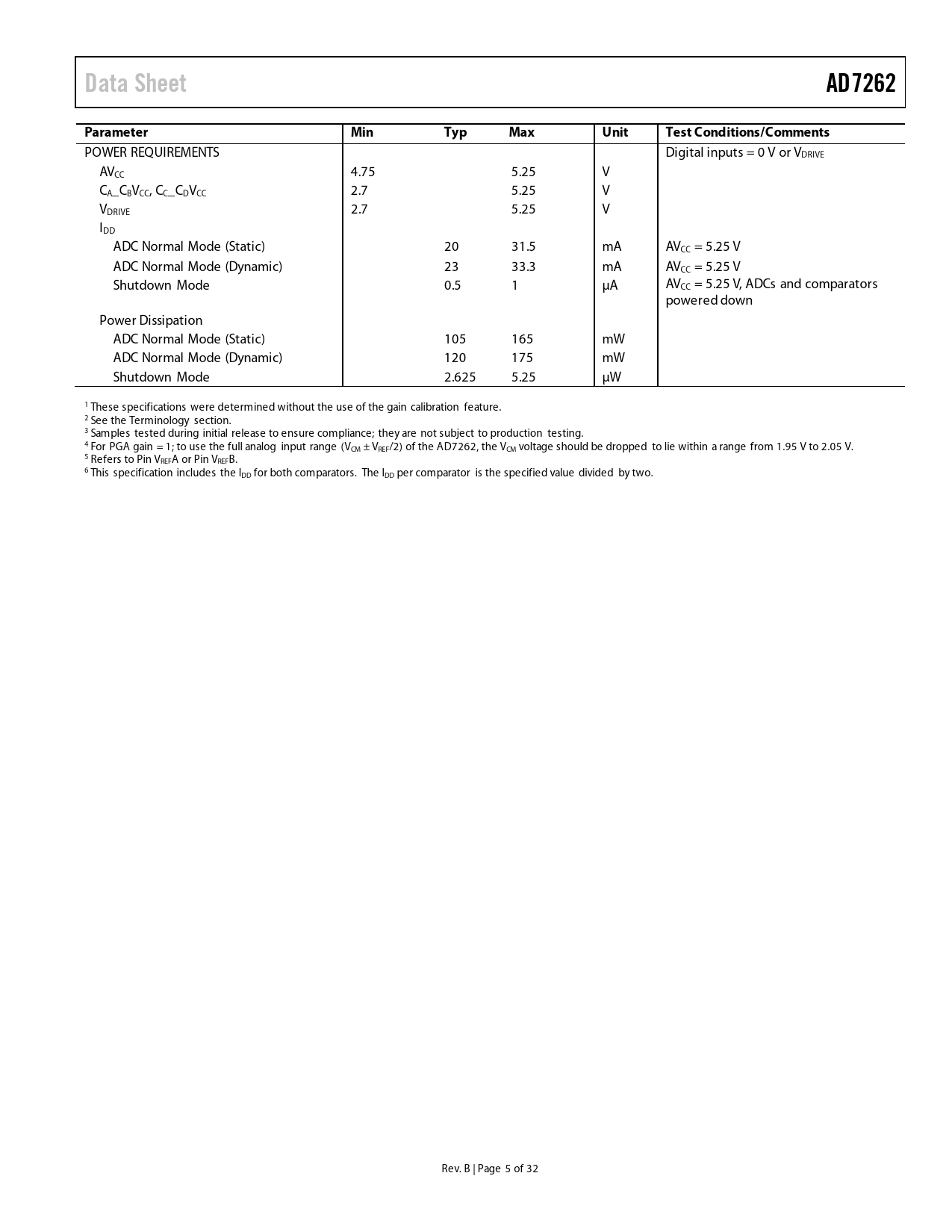 Data Sheet. AD7262. Parameter. Min. Typ. Max. Unit. Test Conditions/Comments