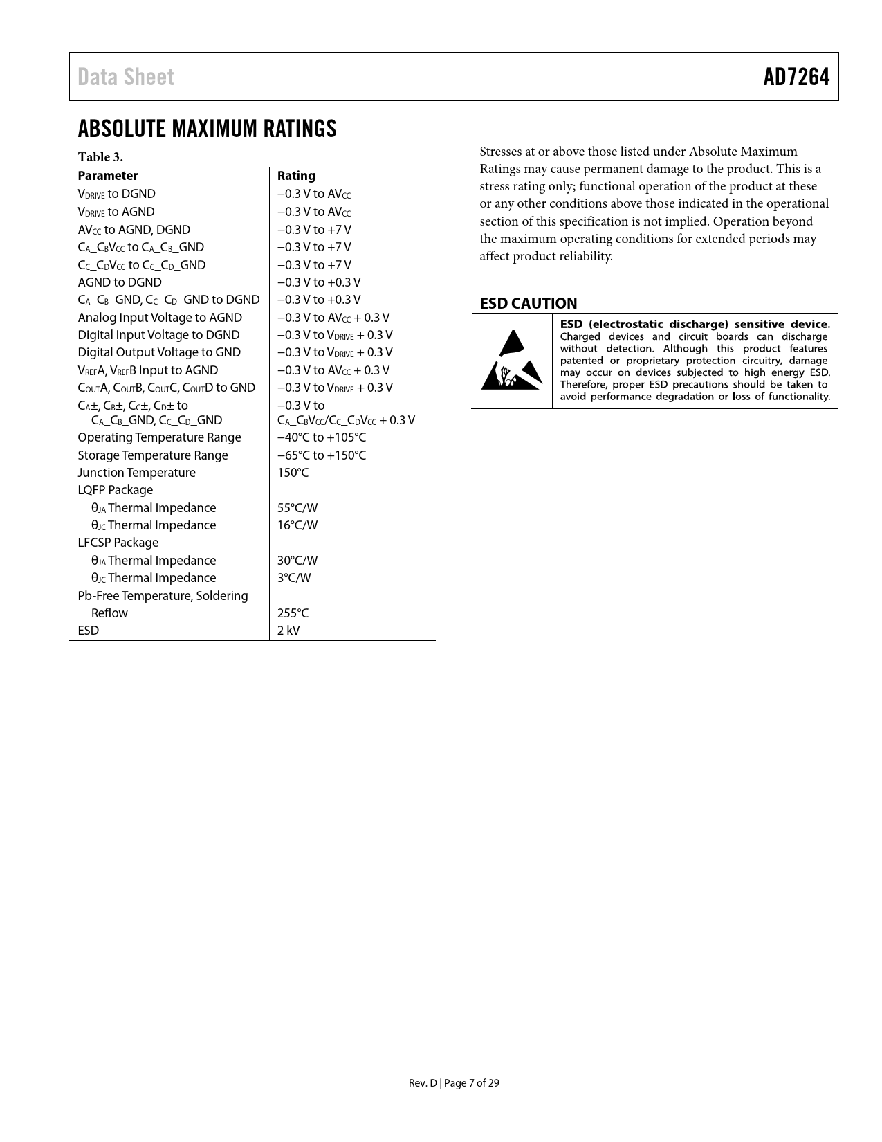 Data Sheet AD7264 ABSOLUTE MAXIMUM RATINGS Table 3 Parameter Rating ESD CAUTION