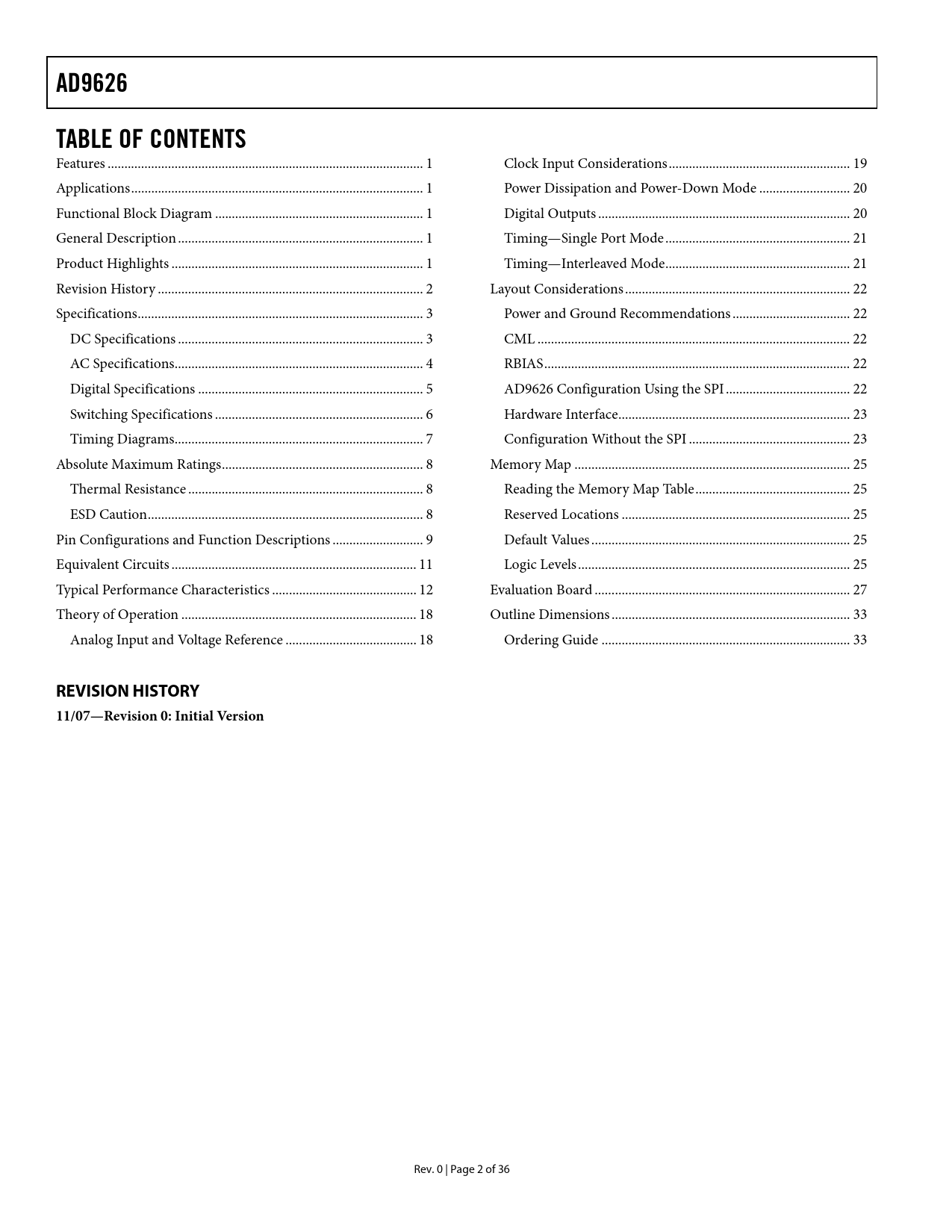 Seiten / Seite37 / 3 — AD9626. TABLE OF CONTENTS. REVISION HISTORY. 11/07—Revision 0: Initial …