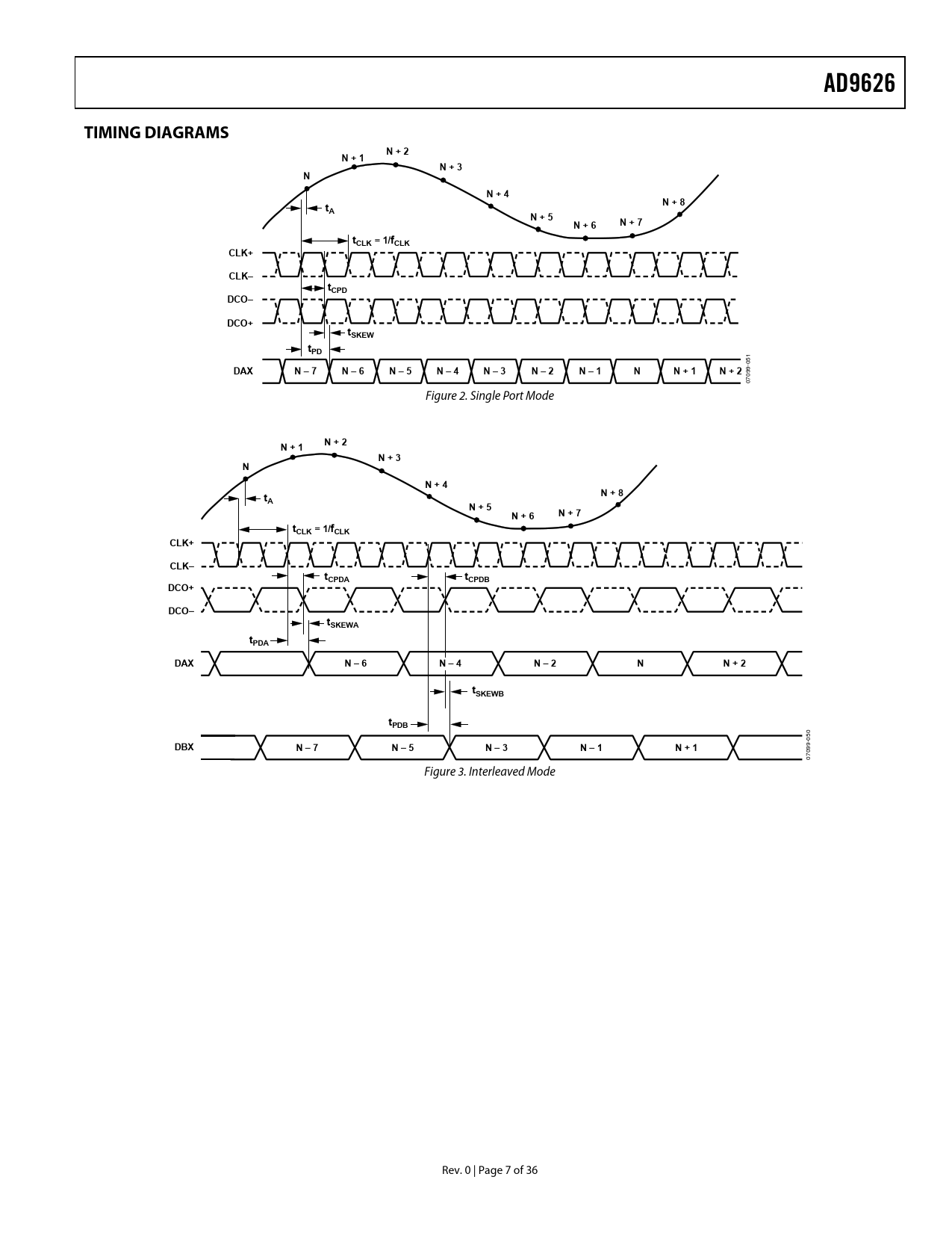 AD9626. TIMING DIAGRAMS. N + 2. N + 1. N + 3. N + 4. N + 8. N + 5. N + 6. N + 7. tCLK = 1/fCLK. CLK+. CLK–. tCPD. DCO–. DCO+. tSKEW. tPD. DAX. N – 7. N – 6