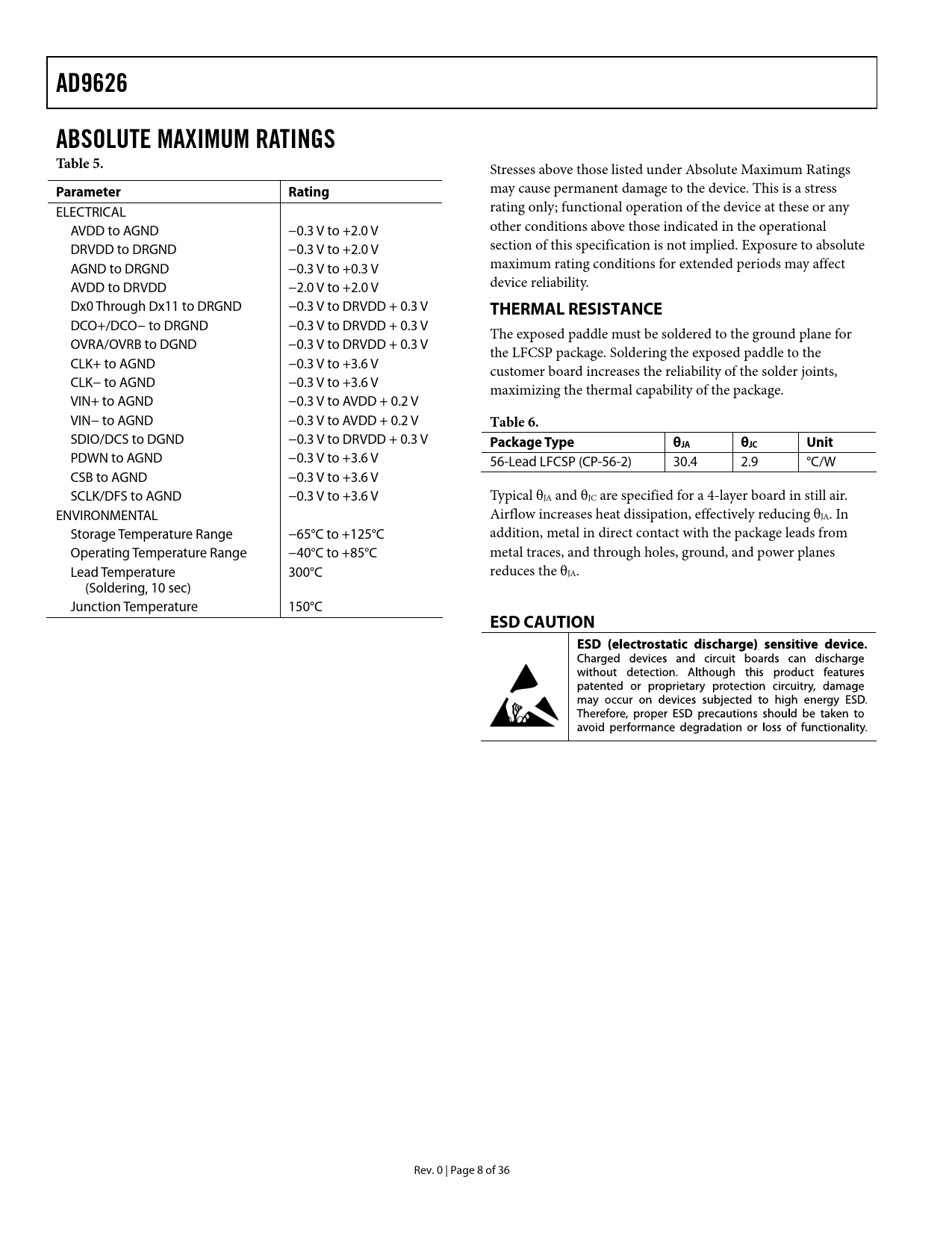 AD9626 ABSOLUTE MAXIMUM RATINGS Table 5 Parameter Rating THERMAL RESISTANCE Table 6 Package Type θJA θJC Unit ESD CAUTION