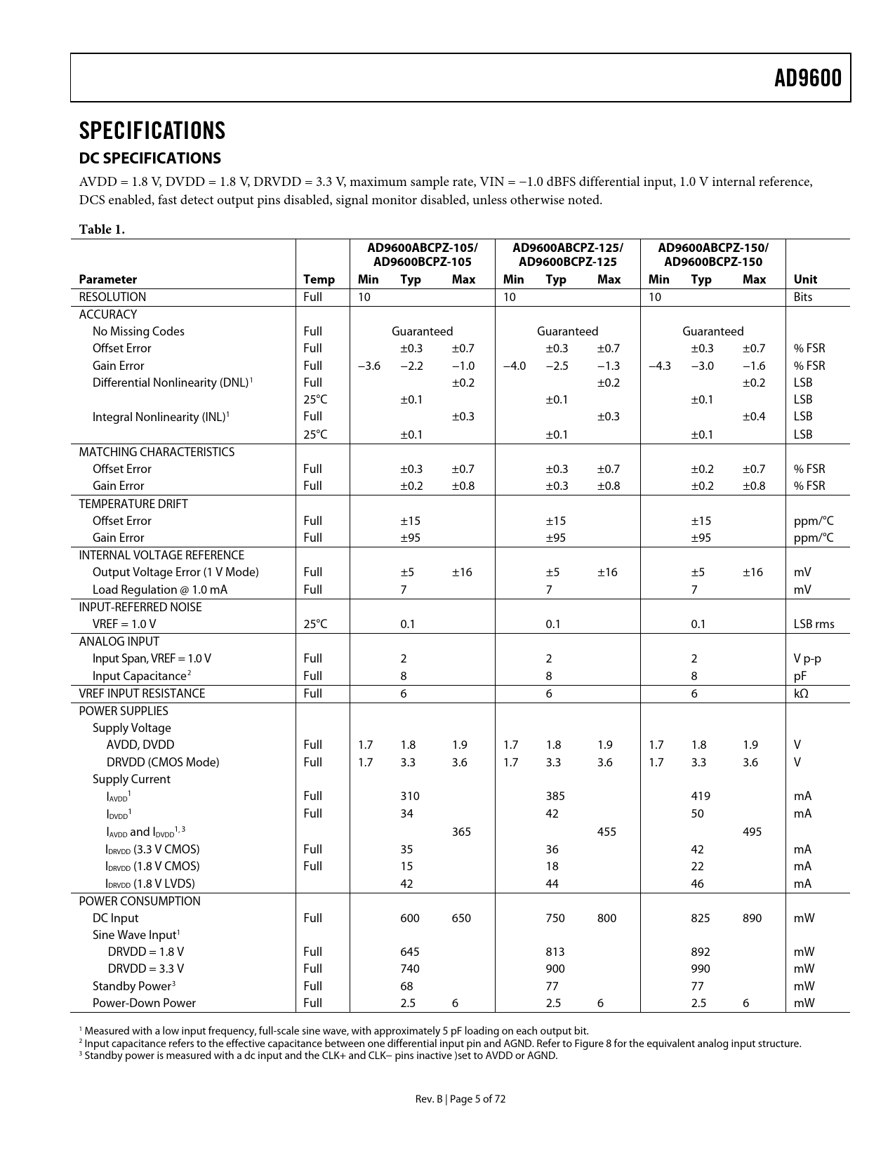 link to page 6 link to page 6 link to page 7 link to page 6 link to page 6 link to page 6 link to page 6 link to page 6 AD9600SPECIFICATIONS DC SPECIFICATIONS AVDD = 1.8 V, DVDD = 1.8 V, DRVDD = 3.3 V, maximum sample rate, VIN = −1.0 dBFS differential input, 1.0 V internal reference, DCS enabled, fast detect output pins disabled, signal monitor disabled, unless otherwise noted. Table 1.AD9600ABCPZ-105/AD9600ABCPZ-125/AD9600ABCPZ-150/AD9600BCPZ-105AD9600BCPZ-125AD9600BCPZ-150Parameter TempMinTyp Max MinTyp Max MinTyp Max Unit RESOLUTION Full 10 10 10 Bits ACCURACY No Missing Codes Full Guaranteed Guaranteed Guaranteed Offset Error Full ±0.3 ±0.7 ±0.3 ±0.7 ±0.3 ±0.7 % FSR Gain Error Full −3.6 −2.2 −1.0 −4.0 −2.5 −1.3 −4.3 −3.0 −1.6 % FSR Differential Nonlinearity (DNL)1 Full ±0.2 ±0.2 ±0.2 LSB 25°C ±0.1 ±0.1 ±0.1 LSB Integral Nonlinearity (INL)1 Full ±0.3 ±0.3 ±0.4 LSB 25°C ±0.1 ±0.1 ±0.1 LSB MATCHING CHARACTERISTICS Offset Error Full ±0.3 ±0.7 ±0.3 ±0.7 ±0.2 ±0.7 % FSR Gain Error Full ±0.2 ±0.8 ±0.3 ±0.8 ±0.2 ±0.8 % FSR TEMPERATURE DRIFT Offset Error Full ±15 ±15 ±15 ppm/°C Gain Error Full ±95 ±95 ±95 ppm/°C INTERNAL VOLTAGE REFERENCE Output Voltage Error (1 V Mode) Full ±5 ±16 ±5 ±16 ±5 ±16 mV Load Regulation @ 1.0 mA Full 7 7 7 mV INPUT-REFERRED NOISE VREF = 1.0 V 25°C 0.1 0.1 0.1 LSB rms ANALOG INPUT Input Span, VREF = 1.0 V Full 2 2 2 V p-p Input Capacitance2 Full 8 8 8 pF VREF INPUT RESISTANCE Full 6 6 6 kΩ POWER SUPPLIES Supply Voltage AVDD, DVDD Full 1.7 1.8 1.9 1.7 1.8 1.9 1.7 1.8 1.9 V DRVDD (CMOS Mode) Full 1.7 3.3 3.6 1.7 3.3 3.6 1.7 3.3 3.6 V Supply Current I 1 AVDD Full 310 385 419 mA I 1 DVDD Full 34 42 50 mA I 1, 3 AVDD and IDVDD 365 455 495 IDRVDD (3.3 V CMOS) Full 35 36 42 mA IDRVDD (1.8 V CMOS) Full 15 18 22 mA IDRVDD (1.8 V LVDS) 42 44 46 mA POWER CONSUMPTION DC Input Full 600 650 750 800 825 890 mW Sine Wave Input1 DRVDD = 1.8 V Full 645 813 892 mW DRVDD = 3.3 V Full 740 900 990 mW Standby Power3 Full 68 77 77 mW Power-Down Power Full 2.5 6 2.5 6 2.5 6 mW 1 Measured with a low input frequency, full-scale sine wave, with approximately 5 pF loading on each output bit. 2 Input capacitance refers to the effective capacitance between one differential input pin and AGND. Refer to Figure 8 for the equivalent analog input structure. 3 Standby power is measured with a dc input and the CLK+ and CLK− pins inactive )set to AVDD or AGND. Rev. B | Page 5 of 72 Document Outline FEATURES APPLICATIONS PRODUCT HIGHLIGHTS FUNCTIONAL BLOCK DIAGRAM TABLE OF CONTENTS REVISION HISTORY GENERAL DESCRIPTION SPECIFICATIONS DC SPECIFICATIONS AC SPECIFICATIONS DIGITAL SPECIFICATIONS SWITCHING SPECIFICATIONS TIMING CHARACTERISTICS TIMING DIAGRAMS ABSOLUTE MAXIMUM RATINGS THERMAL CHARACTERISTICS ESD CAUTION PIN CONFIGURATION AND FUNCTION DESCRIPTIONS EQUIVALENT CIRCUITS TYPICAL PERFORMANCE CHARACTERISTICS THEORY OF OPERATION ADC ARCHITECTURE ANALOG INPUT CONSIDERATIONS Input Common Mode Differential Input Configurations Single-Ended Input Configuration VOLTAGE REFERENCE Internal Reference Connection External Reference Operation CLOCK INPUT CONSIDERATIONS Clock Input Options Input Clock Divider Clock Duty Cycle Jitter Considerations POWER DISSIPATION AND STANDBY MODE DIGITAL OUTPUTS Digital Output Enable Function (OEB) TIMING Data Clock Output (DCO) ADC OVERRANGE AND GAIN CONTROL FAST DETECT OVERVIEW ADC FAST MAGNITUDE ADC OVERRANGE (OR) GAIN SWITCHING Coarse Upper Threshold (C_UT) Fine Upper Threshold (F_UT) Fine Lower Threshold (F_LT) Increment Gain (IG) and Decrement Gain (DG) SIGNAL MONITOR PEAK DETECTOR MODE RMS/MS MAGNITUDE MODE THRESHOLD CROSSING MODE ADDITIONAL CONTROL BITS Signal Monitor Enable Bit Complex Power Calculation Mode Enable Bit DC CORRECTION DC Correction Bandwidth DC Correction Readback DC Correction Freeze DC Correction Enable Bits SIGNAL MONITOR SPORT OUTPUT SMI SCLK SMI SDFS SMI SDO BUILT-IN SELF-TEST (BIST) AND OUTPUT TEST BUILT-IN SELF-TEST (BIST) OUTPUT TEST MODES CHANNEL/CHIP SYNCHRONIZATION SERIAL PORT INTERFACE (SPI) CONFIGURATION USING THE SPI HARDWARE INTERFACE CONFIGURATION WITHOUT THE SPI SPI ACCESSIBLE FEATURES MEMORY MAP READING THE MEMORY MAP TABLE Open Locations Default Values Logic Levels Transfer Register Map Channel-Specific Registers MEMORY MAP MEMORY MAP REGISTER DESCRIPTION Sync Control (Register 0x100) Bit 7—Signal Monitor Sync Enable Bits [6:3]—Reserved Bit 2—Clock Divider Next Sync Only Bit 1—Clock Divider Sync Enable Bit 0—Master Sync Enable Fast Detect Control (Register 0x104) Bits [7:4]—Reserved Bits [3:1]—Fast Detect Mode Select Bit 0—Fast Detect Enable Coarse Upper Threshold (Register 0x105) Bits [7:3]—Reserved Bits [2:0]—Coarse Upper Threshold Fine Upper Threshold (Register 0x106 and Register 0x107) Register 0x106, Bits [7:0]—Fine Upper Threshold [7:0] Register 0x107, Bits [7:5]—Reserved Register 0x107, Bits [4:0]—Fine Upper Threshold [12:8] Fine Lower Threshold (Register 0x108 and Register 0x109) Register 0x108, Bits [7:0]—Fine Lower Threshold [7:0]Register 0x109, Bits [7:5]—ReservedRegister 0x109, Bits [4:0]—Fine Lower Threshold [12:8] Increase Gain Dwell Time (Register 0x10A andRegister 0x10B) Register 0x10A, Bits [7:0]—Increase Gain Dwell Time [7:0]Register 0x10B, Bits [7:0]—Increase Gain Dwell Time [15:8] Signal Monitor DC Correction Control (Register 0x10C) Bit 7—ReservedBit 6—DC Correction Freeze Bits [5:2]—DC Correction Bandwidth Bit 1—DC Correction for Signal Path Enable Bit 0—DC Correction for Signal Monitor Enable Signal Monitor DC Value Channel A (Register 0x10D and Register 0x10E) Register 0x10D, Bits [7:0]—DC Value Channel A [7:0] Register 0x10E, Bits [7:6]—Reserved Register 0x10E, Bits [5:0]—DC Value Channel A [13:8] Signal Monitor DC Value Channel B (Register 0x10F and Register 0x110) Register 0x10F Bits [7:0]—DC Value Channel B [7:0] Register 0x110 Bits [7:6]—Reserved Register 0x110 Bits [5:0]—DC Value Ch