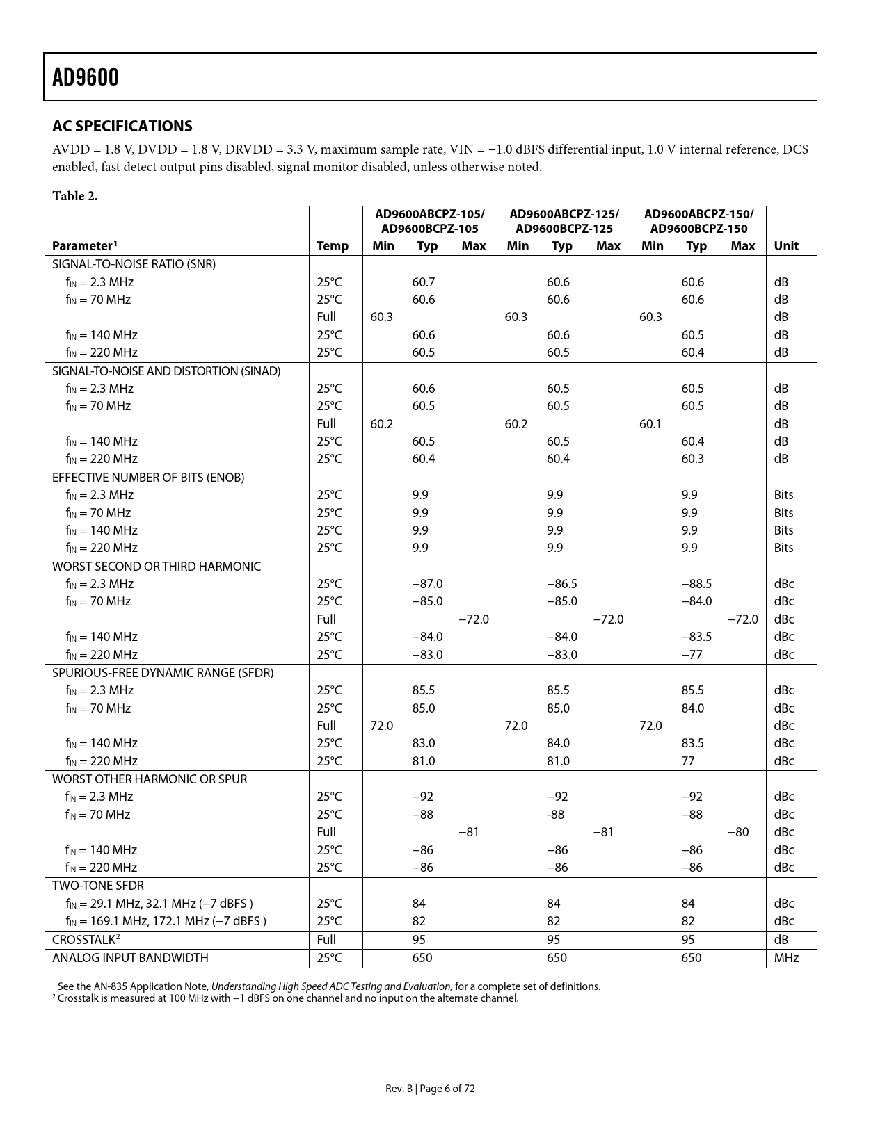 AD9600 AC SPECIFICATIONS Table 2 AD9600ABCPZ-105/ AD9600ABCPZ-125/ AD9600ABCPZ-150/ AD9600BCPZ-105 AD9600BCPZ-125