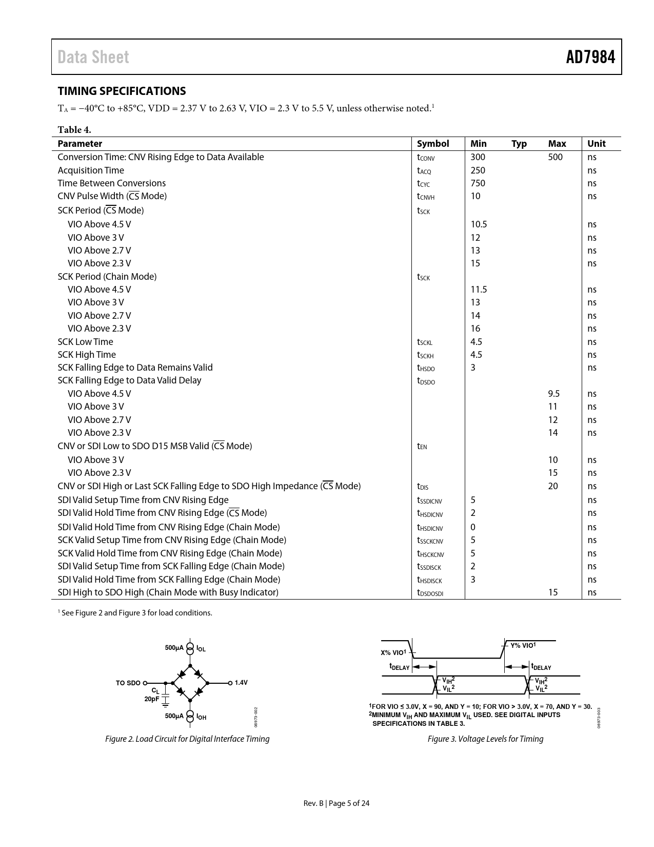 Data Sheet. AD7984. TIMING SPECIFICATIONS. Table 4. Parameter. Symbol. Min. Typ. Max. Unit. 500µA. Y% VIO1. X% VIO1. tDELAY. TO SDO. 1.4V. VIH. 20pF