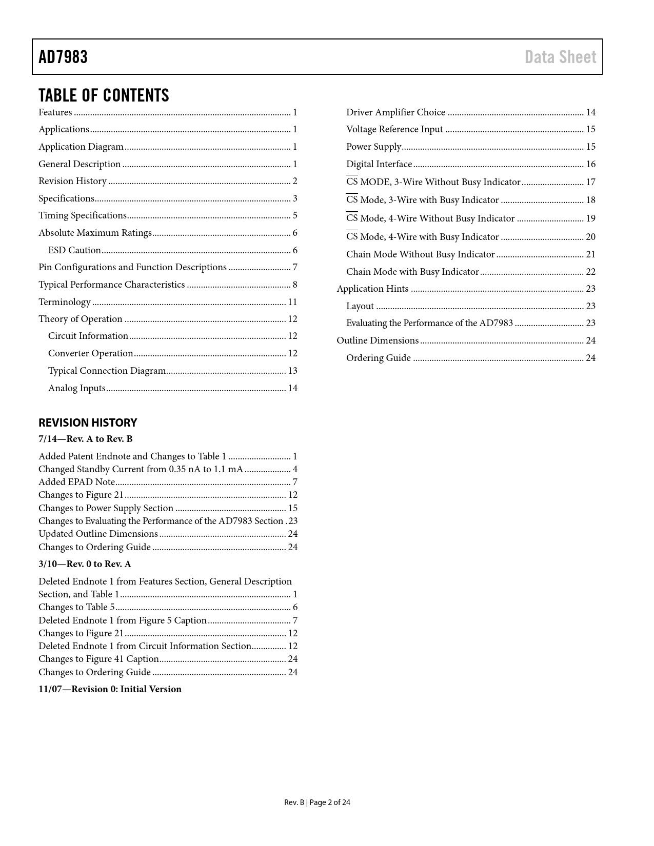 Seiten / Seite25 / 3 — AD7983. Data Sheet. TABLE OF CONTENTS. REVISION HISTORY 7/14—Rev. A to …