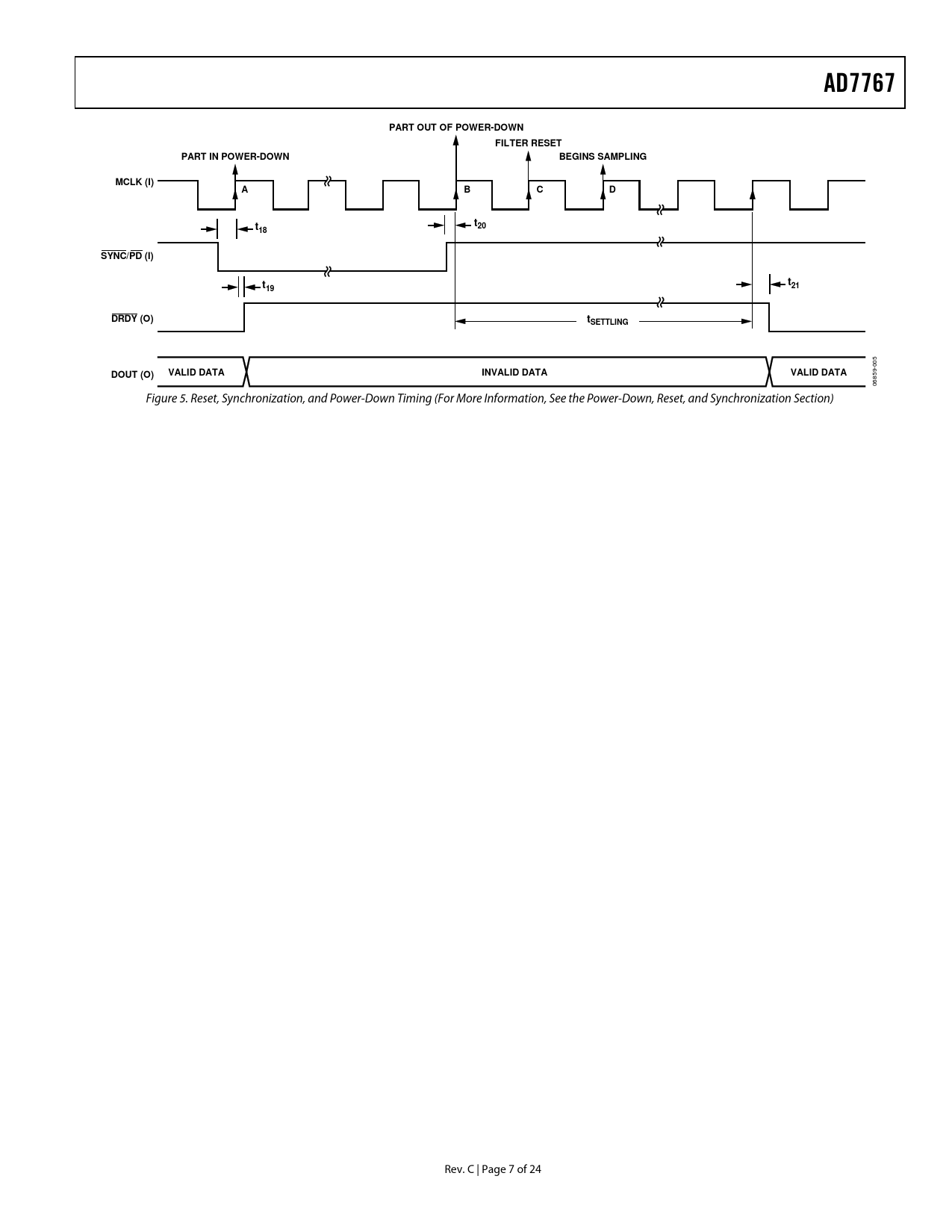 AD7767 PART OUT OF POWER-DOWN FILTER RESET PART IN POWER-DOWN BEGINS SAMPLING MCLK (I) A B C D t t20 18 SYNC/PD (I) t t 19 21 DRDY (O) tSETTLING