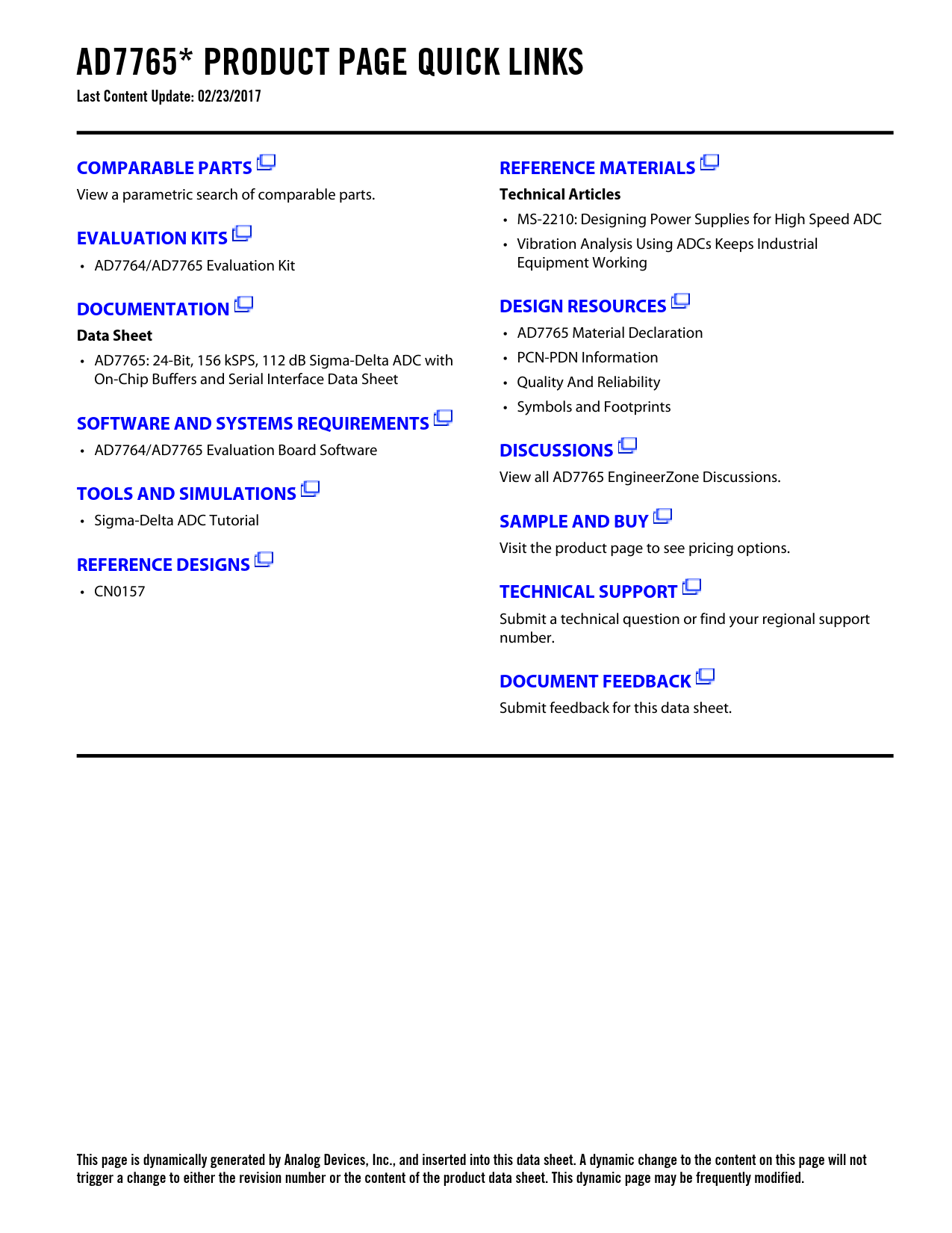 AD7765* PRODUCT PAGE QUICK LINKS Last Content Update: 02/23/2017. COMPARABLE PARTS. REFERENCE MATERIALS. Technical Articles
