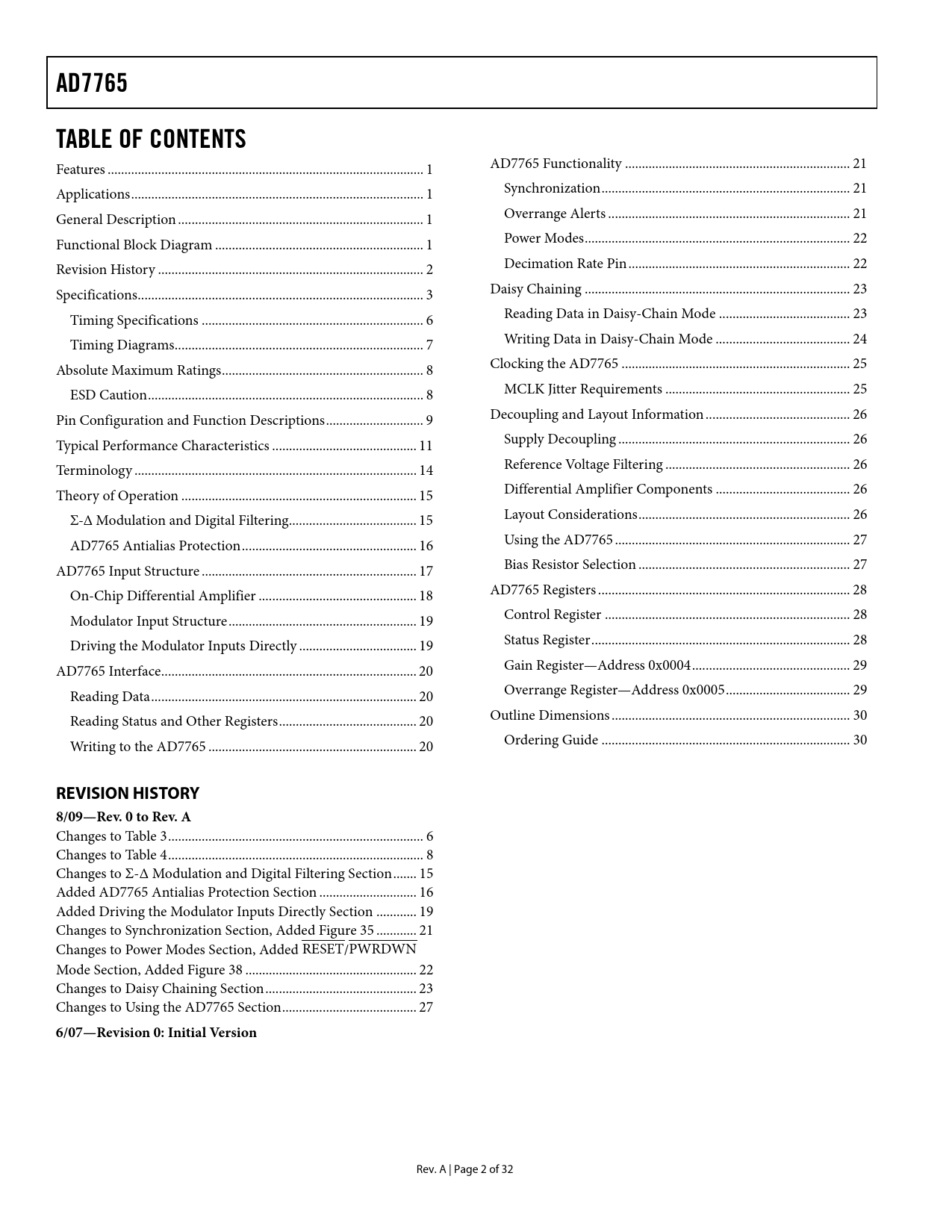 link to page 1 link to page 1 link to page 1 link to page 1 link to page 3 link to page 4 link to page 7 link to page 8 link to page 9 link to page 9 link to page 10 link to page 12 link to page 15 link to page 16 link to page 16 link to page 17 link to page 18 link to page 19 link to page 20 link to page 20 link to page 21 link to page 21 link to page 21 link to page 21 link to page 22 link to page 22 link to page 22 link to page 23 link to page 23 link to page 24 link to page 24 link to page 25 link to page 26 link to page 26 link to page 27 link to page 27 link to page 27 link to page 27 link to page 27 link to page 28 link to page 28 link to page 29 link to page 29 link to page 29 link to page 30 link to page 30 link to page 31 link to page 31 AD7765TABLE OF CONTENTS Features .. 1 AD7765 Functionality ... 21 Applications ... 1 Synchronization .. 21 General Description ... 1 Overrange Alerts .. 21 Functional Block Diagram .. 1 Power Modes ... 22 Revision History ... 2 Decimation Rate Pin .. 22 Specifications ... 3 Daisy Chaining ... 23 Timing Specifications .. 6 Reading Data in Daisy-Chain Mode ... 23 Timing Diagrams .. 7 Writing Data in Daisy-Chain Mode .. 24 Absolute Maximum Ratings .. 8 Clocking the AD7765 .. 25 ESD Caution .. 8 MCLK Jitter Requirements ... 25 Pin Configuration and Function Descriptions ... 9 Decoupling and Layout Information ... 26 Typical Performance Characteristics ... 11 Supply Decoupling ... 26 Terminology .. 14 Reference Voltage Filtering ... 26 Theory of Operation .. 15 Differential Amplifier Components .. 26 Σ-Δ Modulation and Digital Filtering .. 15 Layout Considerations ... 26 AD7765 Antialias Protection .. 16 Using the AD7765 .. 27 AD7765 Input Structure .. 17 Bias Resistor Selection ... 27 On-Chip Differential Amplifier ... 18 AD7765 Registers ... 28 Modulator Input Structure .. 19 Control Register ... 28 Driving the Modulator Inputs Directly ... 19 Status Register ... 28 AD7765 Interface .. 20 Gain Register—Address 0x0004 ... 29 Reading Data ... 20 Overrange Register—Address 0x0005 ... 29 Reading Status and Other Registers ... 20 Outline Dimensions ... 30 Writing to the AD7765 .. 20 Ordering Guide .. 30 REVISION HISTORY 8/09—Rev. 0 to Rev. A Changes to Table 3 .. 6 Changes to Table 4 .. 8 Changes to Σ-Δ Modulation and Digital Filtering Section ... 15 Added AD7765 Antialias Protection Section ... 16 Added Driving the Modulator Inputs Directly Section .. 19 Changes to Synchronization Section, Added Figure 35 .. 21 Changes to Power Modes Section, Added RESET/PWRDWN Mode Section, Added Figure 38 ... 22 Changes to Daisy Chaining Section ... 23 Changes to Using the AD7765 Section .. 27 6/07—Revision 0: Initial Version Rev. A | Page 2 of 32 Document Outline Features Applications General Description Functional Block Diagram Revision History Specifications Timing Specifications Timing Diagrams Absolute Maximum Ratings ESD Caution Pin Configuration and Function Descriptions Typical Performance Characteristics Terminology Theory of Operation Σ-Δ Modulation and Digital Filtering AD7765 Antialias Protection AD7765 Input Structure On-Chip Differential Amplifier Modulator Input Structure Driving the Modulator Inputs Directly AD7765 Interface Reading Data Reading Status and Other Registers Writing to the AD7765 AD7765 Functionality Synchronization Overrange Alerts Power Modes Low Power Mode RESET/PWRDWN Mode Decimation Rate Pin Daisy Chaining Reading Data in Daisy-Chain Mode Writing Data in Daisy-Chain Mode Clocking the AD7765 MCLK Jitter Requirements Example 1 Example 2 Decoupling and Layout Information Supply Decoupling Reference Voltage Filtering Differential Amplifier Components Layout Considerations Using the AD7765 Bias Resistor Selection AD7765 Registers Control Register Status Register Gain Register—Address 0x0004 Non-Bit-Mapped, Default Value 0xA000 Overrange Register—Address 0x0005 Non-Bit-Mapped, Default Value 0xCCCC Outline Dimensions Ordering Guide