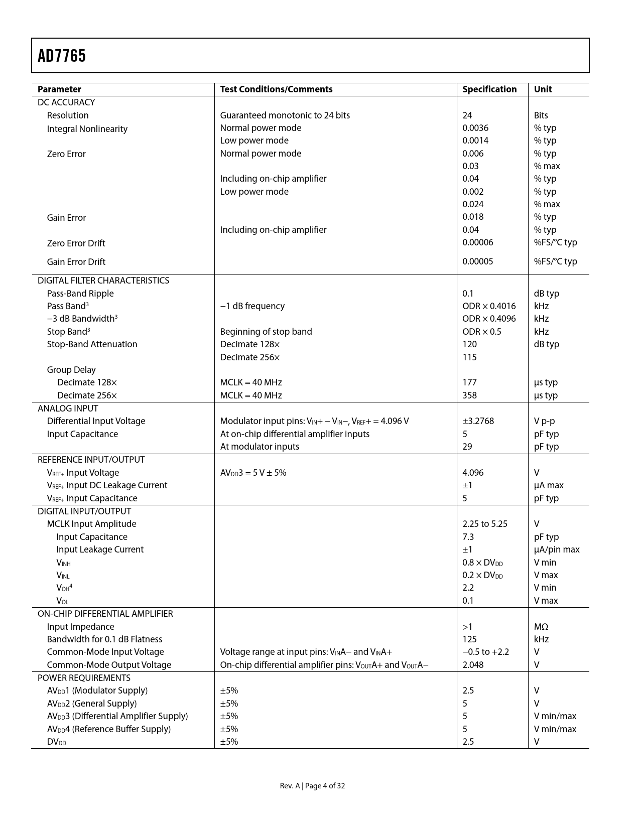 link to page 5 link to page 5 link to page 6 link to page 6 link to page 6 AD7765ParameterTest Conditions/CommentsSpecificationUnit DC ACCURACY Resolution Guaranteed monotonic to 24 bits 24 Bits Integral Nonlinearity Normal power mode 0.0036 % typ Low power mode 0.0014 % typ Zero Error Normal power mode 0.006 % typ 0.03 % max Including on-chip amplifier 0.04 % typ Low power mode 0.002 % typ 0.024 % max Gain Error 0.018 % typ Including on-chip amplifier 0.04 % typ Zero Error Drift 0.00006 %FS/°C typ Gain Error Drift 0.00005 %FS/°C typ DIGITAL FILTER CHARACTERISTICS Pass-Band Ripple 0.1 dB typ Pass Band3 −1 dB frequency ODR × 0.4016 kHz −3 dB Bandwidth3 ODR × 0.4096 kHz Stop Band3 Beginning of stop band ODR × 0.5 kHz Stop-Band Attenuation Decimate 128× 120 dB typ Decimate 256× 115 Group Delay Decimate 128× MCLK = 40 MHz 177 µs typ Decimate 256× MCLK = 40 MHz 358 µs typ ANALOG INPUT Differential Input Voltage Modulator input pins: VIN+ − VIN−, VREF+ = 4.096 V ±3.2768 V p-p Input Capacitance At on-chip differential amplifier inputs 5 pF typ At modulator inputs 29 pF typ REFERENCE INPUT/OUTPUT VREF+ Input Voltage AVDD3 = 5 V ± 5% 4.096 V VREF+ Input DC Leakage Current ±1 µA max VREF+ Input Capacitance 5 pF typ DIGITAL INPUT/OUTPUT MCLK Input Amplitude 2.25 to 5.25 V Input Capacitance 7.3 pF typ Input Leakage Current ±1 μA/pin max VINH 0.8 × DVDD V min VINL 0.2 × DVDD V max V 4 OH 2.2 V min VOL 0.1 V max ON-CHIP DIFFERENTIAL AMPLIFIER Input Impedance >1 MΩ Bandwidth for 0.1 dB Flatness 125 kHz Common-Mode Input Voltage Voltage range at input pins: VINA− and VINA+ −0.5 to +2.2 V Common-Mode Output Voltage On-chip differential amplifier pins: VOUTA+ and VOUTA− 2.048 V POWER REQUIREMENTS AVDD1 (Modulator Supply) ±5% 2.5 V AVDD2 (General Supply) ±5% 5 V AVDD3 (Differential Amplifier Supply) ±5% 5 V min/max AVDD4 (Reference Buffer Supply) ±5% 5 V min/max DVDD ±5% 2.5 V Rev. A | Page 4 of 32 Document Outline Features Applications General Description Functional Block Diagram Revision History Specifications Timing Specifications Timing Diagrams Absolute Maximum Ratings ESD Caution Pin Configuration and Function Descriptions Typical Performance Characteristics Terminology Theory of Operation Σ-Δ Modulation and Digital Filtering AD7765 Antialias Protection AD7765 Input Structure On-Chip Differential Amplifier Modulator Input Structure Driving the Modulator Inputs Directly AD7765 Interface Reading Data Reading Status and Other Registers Writing to the AD7765 AD7765 Functionality Synchronization Overrange Alerts Power Modes Low Power Mode RESET/PWRDWN Mode Decimation Rate Pin Daisy Chaining Reading Data in Daisy-Chain Mode Writing Data in Daisy-Chain Mode Clocking the AD7765 MCLK Jitter Requirements Example 1 Example 2 Decoupling and Layout Information Supply Decoupling Reference Voltage Filtering Differential Amplifier Components Layout Considerations Using the AD7765 Bias Resistor Selection AD7765 Registers Control Register Status Register Gain Register—Address 0x0004 Non-Bit-Mapped, Default Value 0xA000 Overrange Register—Address 0x0005 Non-Bit-Mapped, Default Value 0xCCCC Outline Dimensions Ordering Guide