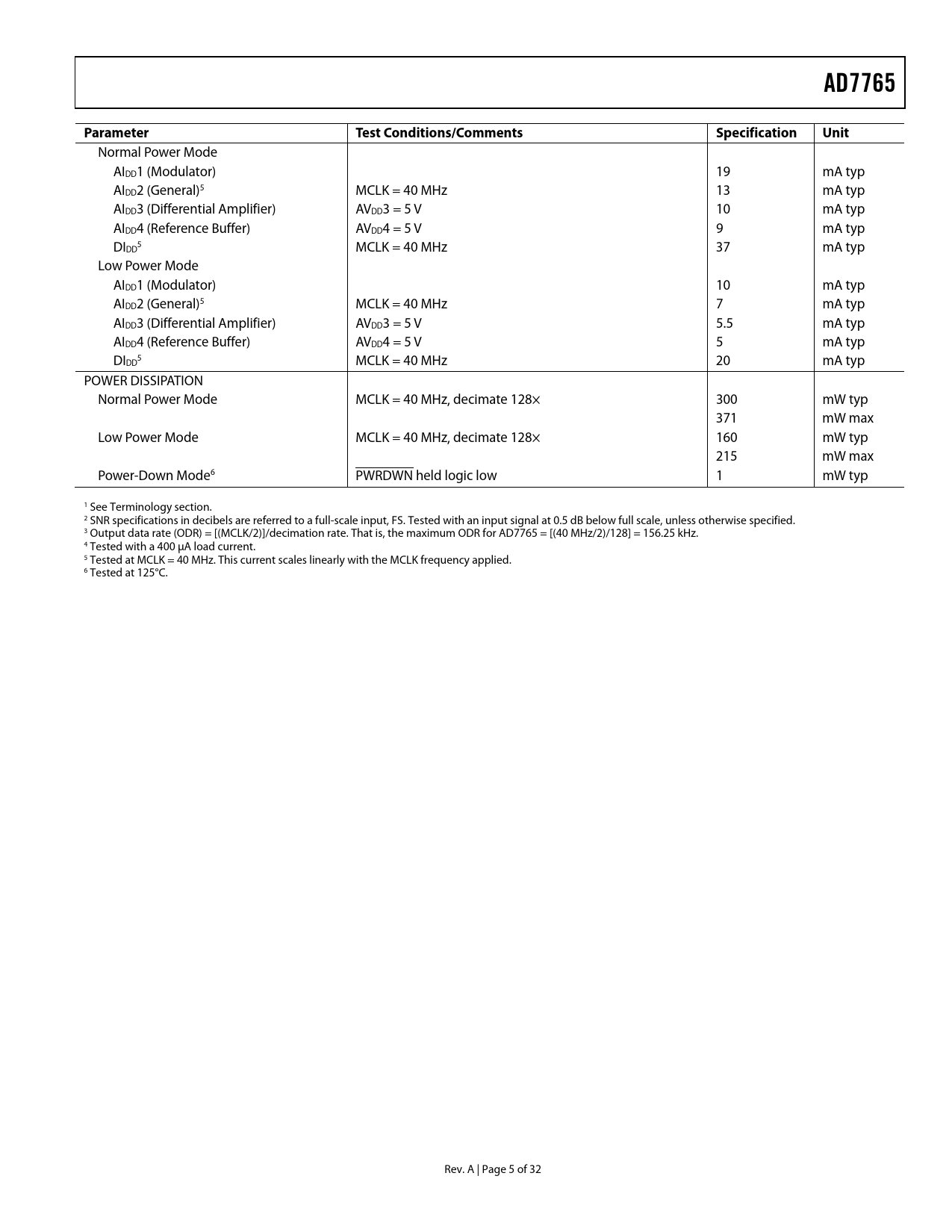 link to page 6 link to page 6 link to page 6 link to page 15 link to page 6 link to page 6 link to page 6 link to page 6 link to page 6 AD7765ParameterTest Conditions/CommentsSpecificationUnit Normal Power Mode AIDD1 (Modulator) 19 mA typ AIDD2 (General)5 MCLK = 40 MHz 13 mA typ AIDD3 (Differential Amplifier) AVDD3 = 5 V 10 mA typ AIDD4 (Reference Buffer) AVDD4 = 5 V 9 mA typ DI 5 DD MCLK = 40 MHz 37 mA typ Low Power Mode AIDD1 (Modulator) 10 mA typ AIDD2 (General)5 MCLK = 40 MHz 7 mA typ AIDD3 (Differential Amplifier) AVDD3 = 5 V 5.5 mA typ AIDD4 (Reference Buffer) AVDD4 = 5 V 5 mA typ DI 5 DD MCLK = 40 MHz 20 mA typ POWER DISSIPATION Normal Power Mode MCLK = 40 MHz, decimate 128× 300 mW typ 371 mW max Low Power Mode MCLK = 40 MHz, decimate 128× 160 mW typ 215 mW max Power-Down Mode6 PWRDWN held logic low 1 mW typ 1 See Terminology section. 2 SNR specifications in decibels are referred to a full-scale input, FS. Tested with an input signal at 0.5 dB below full scale, unless otherwise specified. 3 Output data rate (ODR) = [(MCLK/2)]/decimation rate. That is, the maximum ODR for AD7765 = [(40 MHz/2)/128] = 156.25 kHz. 4 Tested with a 400 µA load current. 5 Tested at MCLK = 40 MHz. This current scales linearly with the MCLK frequency applied. 6 Tested at 125°C. Rev. A | Page 5 of 32 Document Outline Features Applications General Description Functional Block Diagram Revision History Specifications Timing Specifications Timing Diagrams Absolute Maximum Ratings ESD Caution Pin Configuration and Function Descriptions Typical Performance Characteristics Terminology Theory of Operation Σ-Δ Modulation and Digital Filtering AD7765 Antialias Protection AD7765 Input Structure On-Chip Differential Amplifier Modulator Input Structure Driving the Modulator Inputs Directly AD7765 Interface Reading Data Reading Status and Other Registers Writing to the AD7765 AD7765 Functionality Synchronization Overrange Alerts Power Modes Low Power Mode RESET/PWRDWN Mode Decimation Rate Pin Daisy Chaining Reading Data in Daisy-Chain Mode Writing Data in Daisy-Chain Mode Clocking the AD7765 MCLK Jitter Requirements Example 1 Example 2 Decoupling and Layout Information Supply Decoupling Reference Voltage Filtering Differential Amplifier Components Layout Considerations Using the AD7765 Bias Resistor Selection AD7765 Registers Control Register Status Register Gain Register—Address 0x0004 Non-Bit-Mapped, Default Value 0xA000 Overrange Register—Address 0x0005 Non-Bit-Mapped, Default Value 0xCCCC Outline Dimensions Ordering Guide