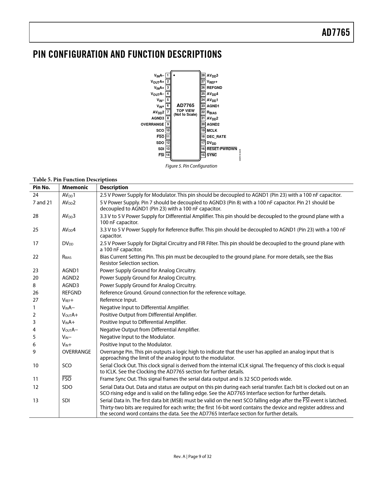 link to page 28 link to page 28 link to page 28 link to page 26 link to page 21 link to page 21 AD7765PIN CONFIGURATION AND FUNCTION DESCRIPTIONSV128INA–AVDD3V227OUTA+VREF+V326INA+REFGNDV425OUTA–AVDD4V524IN–AVDD1V6AD776523IN+AGND1AV7TOP VIEW22DD2RBIAS(Not to Scale)AGND3 821 AVDD2OVERRANGE 920 AGND2SCO 1019 MCLKFSO 1118 DEC_RATESDO 1217 DVDDSDI 1316 RESET/PWRDWN 005 FSI 1415 SYNC 06519- Figure 5. Pin Configuration Table 5. Pin Function Descriptions Pin No.MnemonicDescription 24 AVDD1 2.5 V Power Supply for Modulator. This pin should be decoupled to AGND1 (Pin 23) with a 100 nF capacitor. 7 and 21 AVDD2 5 V Power Supply. Pin 7 should be decoupled to AGND3 (Pin 8) with a 100 nF capacitor. Pin 21 should be decoupled to AGND1 (Pin 23) with a 100 nF capacitor. 28 AVDD3 3.3 V to 5 V Power Supply for Differential Amplifier. This pin should be decoupled to the ground plane with a 100 nF capacitor. 25 AVDD4 3.3 V to 5 V Power Supply for Reference Buffer. This pin should be decoupled to AGND1 (Pin 23) with a 100 nF capacitor. 17 DVDD 2.5 V Power Supply for Digital Circuitry and FIR Filter. This pin should be decoupled to the ground plane with a 100 nF capacitor. 22 RBIAS Bias Current Setting Pin. This pin must be decoupled to the ground plane. For more details, see the Bias Resistor Selection section. 23 AGND1 Power Supply Ground for Analog Circuitry. 20 AGND2 Power Supply Ground for Analog Circuitry. 8 AGND3 Power Supply Ground for Analog Circuitry. 26 REFGND Reference Ground. Ground connection for the reference voltage. 27 VREF+ Reference Input. 1 VINA− Negative Input to Differential Amplifier. 2 VOUTA+ Positive Output from Differential Amplifier. 3 VINA+ Positive Input to Differential Amplifier. 4 VOUTA− Negative Output from Differential Amplifier. 5 VIN− Negative Input to the Modulator. 6 VIN+ Positive Input to the Modulator. 9 OVERRANGE Overrange Pin. This pin outputs a logic high to indicate that the user has applied an analog input that is approaching the limit of the analog input to the modulator. 10 SCO Serial Clock Out. This clock signal is derived from the internal ICLK signal. The frequency of this clock is equal to ICLK. See the Clocking the AD7765 section for further details. 11 FSO Frame Sync Out. This signal frames the serial data output and is 32 SCO periods wide. 12 SDO Serial Data Out. Data and status are output on this pin during each serial transfer. Each bit is clocked out on an SCO rising edge and is valid on the falling edge. See the AD7765 Interface section for further details. 13 SDI Serial Data In. The first data bit (MSB) must be valid on the next SCO falling edge after the FSI event is latched. Thirty-two bits are required for each write; the first 16-bit word contains the device and register address and the second word contains the data. See the AD7765 Interface section for further details. Rev. A | Page 9 of 32 Document Outline Features Applications General Description Functional Block Diagram Revision History Specifications Timing Specifications Timing Diagrams Absolute Maximum Ratings ESD Caution Pin Configuration and Function Descriptions Typical Performance Characteristics Terminology Theory of Operation Σ-Δ Modulation and Digital Filtering AD7765 Antialias Protection AD7765 Input Structure On-Chip Differential Amplifier Modulator Input Structure Driving the Modulator Inputs Directly AD7765 Interface Reading Data Reading Status and Other Registers Writing to the AD7765 AD7765 Functionality Synchronization Overrange Alerts Power Modes Low Power Mode RESET/PWRDWN Mode Decimation Rate Pin Daisy Chaining Reading Data in Daisy-Chain Mode Writing Data in Daisy-Chain Mode Clocking the AD7765 MCLK Jitter Requirements Example 1 Example 2 Decoupling and Layout Information Supply Decoupling Reference Voltage Filtering Differential Amplifier Components Layout Considerations Using the AD7765 Bias Resistor Selection AD7765 Registers Control Register Status Register Gain Register—Address 0x0004 Non-Bit-Mapped, Default Value 0xA000 Overrange Register—Address 0x0005 Non-Bit-Mapped, Default Value 0xCCCC Outline Dimensions Ordering Guide