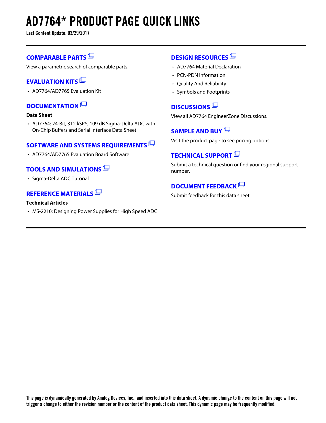 AD7764* PRODUCT PAGE QUICK LINKS Last Content Update: 03/29/2017COMPARABLE PARTSDESIGN RESOURCES View a parametric search of comparable parts. • AD7764 Material Declaration • PCN-PDN Information EVALUATION KITS • Quality And Reliability • AD7764/AD7765 Evaluation Kit • Symbols and Footprints DOCUMENTATIONDISCUSSIONSData Sheet View all AD7764 EngineerZone Discussions. • AD7764: 24-Bit, 312 kSPS, 109 dB Sigma-Delta ADC with On-Chip Buffers and Serial Interface Data Sheet SAMPLE AND BUY Visit the product page to see pricing options. SOFTWARE AND SYSTEMS REQUIREMENTS • AD7764/AD7765 Evaluation Board Software TECHNICAL SUPPORT Submit a technical question or find your regional support TOOLS AND SIMULATIONS number. • Sigma-Delta ADC Tutorial DOCUMENT FEEDBACKREFERENCE MATERIALS Submit feedback for this data sheet. Technical Articles • MS-2210: Designing Power Supplies for High Speed ADC This page is dynamically generated by Analog Devices, Inc., and inserted into this data sheet. A dynamic change to the content on this page will not trigger a change to either the revision number or the content of the product data sheet. This dynamic page may be frequently modified. Document Outline FEATURES APPLICATIONS FUNCTIONAL BLOCK DIAGRAM GENERAL DESCRIPTION REVISION HISTORY SPECIFICATIONS TIMING SPECIFICATIONS Timing Diagrams ABSOLUTE MAXIMUM RATINGS ESD CAUTION PIN CONFIGURATION AND FUNCTION DESCRIPTIONS TYPICAL PERFORMANCE CHARACTERISTICS TERMINOLOGY THEORY OF OPERATION Σ-Δ MODULATION AND DIGITAL FILTERING AD7764 ANTIALIAS PROTECTION INPUT STRUCTURE ON-CHIP DIFFERENTIAL AMPLIFIER MODULATOR INPUT STRUCTURE DRIVING THE MODULATOR INPUTS DIRECTLY AD7764 SERIAL INTERFACE READING DATA READING STATUS AND OTHER REGISTERS WRITING TO THE AD7764 FUNCTIONALITY SYNCHRONIZATION OVERRANGE ALERTS POWER MODES Low Power Mode RESETB/PWRDWNB Mode DECIMATION RATE PIN DAISY-CHAINING READING DATA IN DAISY-CHAIN MODE WRITING DATA IN DAISY-CHAIN MODE CLOCKING THE AD7764 MCLK JITTER REQUIREMENTS Example 1 Example 2 DECOUPLING AND LAYOUT INFORMATION SUPPLY DECOUPLING REFERENCE VOLTAGE FILTERING DIFFERENTIAL AMPLIFIER COMPONENTS LAYOUT CONSIDERATIONS USING THE AD7764 BIAS RESISTOR SELECTION AD7764 REGISTERS CONTROL REGISTER STATUS REGISTER GAIN REGISTER—ADDRESS 0x0004 Nonbit Mapped, Default Value: 0xA000 OVERRANGE REGISTER—ADDRESS 0x0005 Nonbit Mapped, Default Value: 0xCCCC OUTLINE DIMENSIONS ORDERING GUIDE