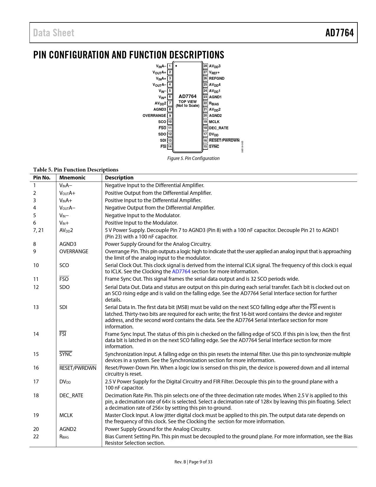 Data Sheet AD7764 PIN CONFIGURATION AND FUNCTION DESCRIPTIONS V 1 28 INA– AVDD3 V 2 27 OUTA+ VREF+ V 3 26 INA+ REFGND V 4 25 OUTA– AVDD4 V 5 24 IN– AVDD1 V 6 AD7764 23 IN+ AGND1 AV 7 TOP VIEW 22 DD2 RBIAS (Not to Scale) AGND3 8 21 AVDD2 OVERRANGE 9 20 AGND2 SCO 10 19 MCLK FSO 11 18 DEC_RATE SDO 12 17 DVDD SDI 13 16 RESET/PWRDWN