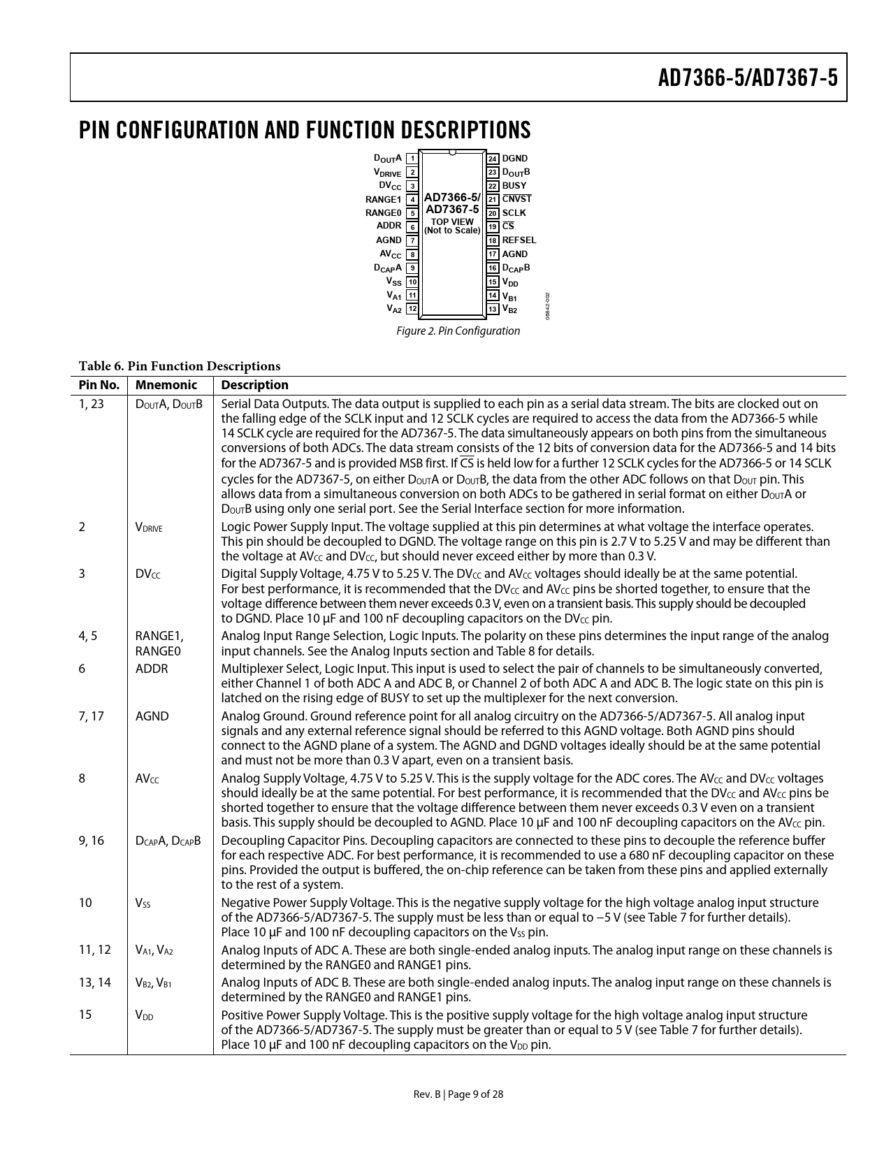 link to page 22 link to page 17 link to page 17 link to page 16 link to page 16 AD7366-5/AD7367-5PIN CONFIGURATION AND FUNCTION DESCRIPTIONSDOUTA 124 DGNDV223DRIVEDOUTBDV3CC22 BUSYRANGE1 4 AD7366-5/ 21 CNVST RANGE0AD7367-5520 SCLKADDRTOP VIEW619 CS(Not to Scale)AGND 718 REFSELAV817 AGNDCCDCAPA 916 DCAPBVSS 1015 VDDV1114A1V 2 B1 00 V1213 2- A2VB2 84 06 Figure 2. Pin Configuration Table 6. Pin Function Descriptions Pin No.MnemonicDescription 1, 23 DOUTA, DOUTB Serial Data Outputs. The data output is supplied to each pin as a serial data stream. The bits are clocked out on the falling edge of the SCLK input and 12 SCLK cycles are required to access the data from the AD7366-5 while 14 SCLK cycle are required for the AD7367-5. The data simultaneously appears on both pins from the simultaneous conversions of both ADCs. The data stream consists of the 12 bits of conversion data for the AD7366-5 and 14 bits for the AD7367-5 and is provided MSB first. If CS is held low for a further 12 SCLK cycles for the AD7366-5 or 14 SCLK cycles for the AD7367-5, on either DOUTA or DOUTB, the data from the other ADC follows on that DOUT pin. This allows data from a simultaneous conversion on both ADCs to be gathered in serial format on either DOUTA or DOUTB using only one serial port. See the Serial Interf sec ace tion for more information. 2 VDRIVE Logic Power Supply Input. The voltage supplied at this pin determines at what voltage the interface operates. This pin should be decoupled to DGND. The voltage range on this pin is 2.7 V to 5.25 V and may be different than the voltage at AVCC and DVCC, but should never exceed either by more than 0.3 V. 3 DVCC Digital Supply Voltage, 4.75 V to 5.25 V. The DVCC and AVCC voltages should ideally be at the same potential. For best performance, it is recommended that the DVCC and AVCC pins be shorted together, to ensure that the voltage difference between them never exceeds 0.3 V, even on a transient basis. This supply should be decoupled to DGND. Place 10 μF and 100 nF decoupling capacitors on the DVCC pin. 4, 5 RANGE1, Analog Input Range Selection, Logic Inputs. The polarity on these pins determines the input range of the analog RANGE0 input channels. See the Analog Inputs section and Table 8 for details. 6 ADDR Multiplexer Select, Logic Input. This input is used to select the pair of channels to be simultaneously converted, either Channel 1 of both ADC A and ADC B, or Channel 2 of both ADC A and ADC B. The logic state on this pin is latched on the rising edge of BUSY to set up the multiplexer for the next conversion. 7, 17 AGND Analog Ground. Ground reference point for all analog circuitry on the AD7366-5/AD7367-5. All analog input signals and any external reference signal should be referred to this AGND voltage. Both AGND pins should connect to the AGND plane of a system. The AGND and DGND voltages ideally should be at the same potential and must not be more than 0.3 V apart, even on a transient basis. 8 AVCC Analog Supply Voltage, 4.75 V to 5.25 V. This is the supply voltage for the ADC cores. The AVCC and DVCC voltages should ideally be at the same potential. For best performance, it is recommended that the DVCC and AVCC pins be shorted together to ensure that the voltage difference between them never exceeds 0.3 V even on a transient basis. This supply should be decoupled to AGND. Place 10 μF and 100 nF decoupling capacitors on the AVCC pin. 9, 16 DCAPA, DCAPB Decoupling Capacitor Pins. Decoupling capacitors are connected to these pins to decouple the reference buffer for each respective ADC. For best performance, it is recommended to use a 680 nF decoupling capacitor on these pins. Provided the output is buffered, the on-chip reference can be taken from these pins and applied externally to the rest of a system. 10 VSS Negative Power Supply Voltage. This is the negative supply voltage for the high voltage analog input structure of the AD7366-5/AD7367-5. The supply must be less than or equal to −5 V (see Table 7 for further details). Place 10 μF and 100 nF decoupling capacitors on the VSS pin. 11, 12 VA1, VA2 Analog Inputs of ADC A. These are both single-ended analog inputs. The analog input range on these channels is determined by the RANGE0 and RANGE1 pins. 13, 14 VB2, VB1 Analog Inputs of ADC B. These are both single-ended analog inputs. The analog input range on these channels is determined by the RANGE0 and RANGE1 pins. 15 VDD Positive Power Supply Voltage. This is the positive supply voltage for the high voltage analog input structure of the AD7366-5/AD7367-5. The supply must be greater than or equal to 5 V (see Table 7 for further details). Place 10 μF and 100 nF decoupling capacitors on the VDD pin. Rev. B | Page 9 of 28 Document Outline FEATURES FUNCTIONAL BLOCK DIAGRAM GENERAL DESCRIPTION PRODUCT HIGHLIGHTS TABLE OF CONTENTS REVISION HISTORY SPECIFICATIONS AD7366-5 SPECIFICATIONS AD7367-5 SPECIFICATIONS TIMING SPECIFICATIONS ABSOLUTE MAXIMUM RATINGS ESD CAUTION PIN CONFIGURATION AND FUNCTION DESCRIPTIONS TYPICAL PERFORMANCE CHARACTERISTICS TERMINOLOGY THEORY OF OPERATION CIRCUIT INFORMATION CONVERTER OPERATION ANALOG INPUTS TRANSFER FUNCTION Track-and-Hold TYPICAL CONNECTION DIAGRAM DRIVER AMPLIFIER CHOICE VDRIVE REFERENCE MODES OF OPERATION NORMAL MODE SHUTDOWN MODE POWER-UP TIMES SERIAL INTERFACE MICROPROCESSOR INTERFACING AD7366-5/AD7367-5 TO ADSP-218x AD7366-5/AD7367-5 TO ADSP-BF53x AD7366-5/AD7367-5 TO TMS320VC5506 AD7366-5/AD7367-5 TO DSP563xx APPLICATION HINTS LAYOUT AND GROUNDING EVALUATING THE AD7366-5/AD7367-5 OUTLINE DIMENSIONS ORDERING GUIDE
