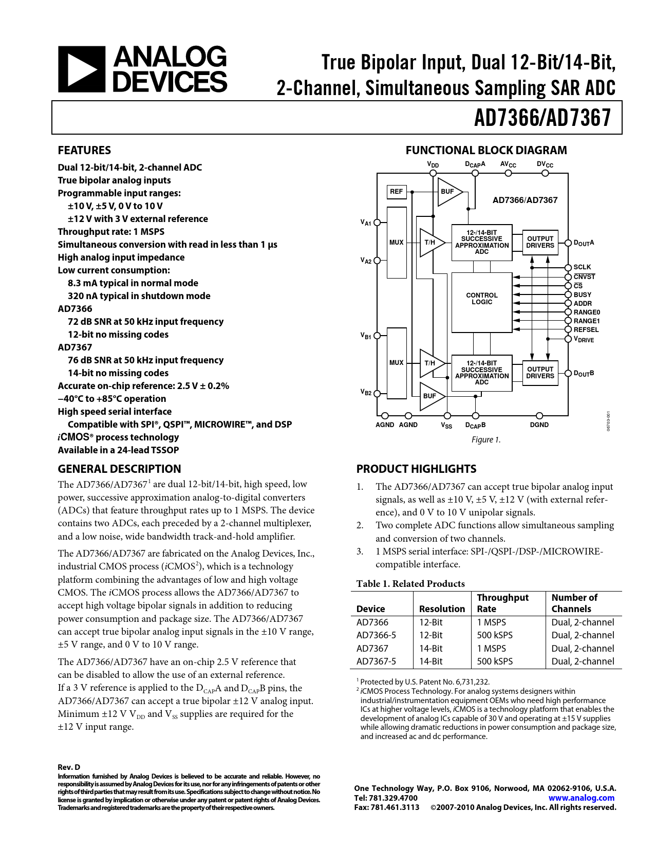 Rev. D Information furnished by Analog Devices is believed to be accurate and reliable. However, no responsibility is assumed by Analog Devices for its use, nor for any infringements of patents or other rights of third parties that may result from its use. Specifications subject to change without notice. No One Technology Way, P.O. Box 9106, Norwood, MA 02062-9106, U.S.A. license is granted by implication or otherwise under any patent or patent rights of Analog Devices. Tel: 781.329.4700 www.analog.com Trademarks and registered trademarks are the property of their respective owners. Fax: 781.461.3113 ©2007-2010 Analog Devices, Inc. All rights reserved.