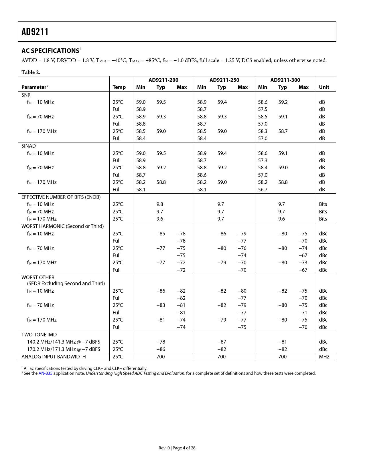 AD9211. AC SPECIFICATIONS1. Table 2. AD9211-200. AD9211-250. AD9211-300. Parameter. Temp. Min. Typ. Max. Unit
