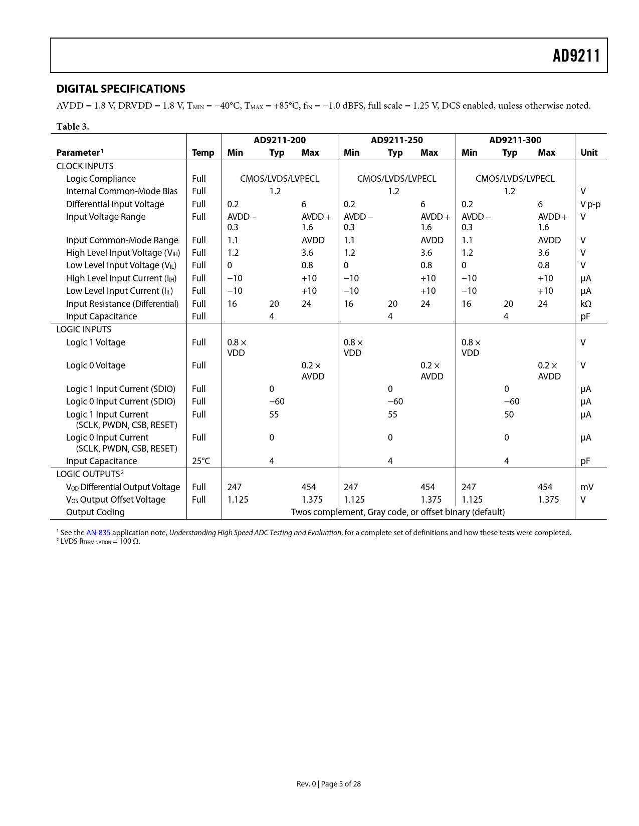 Seiten / Seite29 / 6 — AD9211. DIGITAL SPECIFICATIONS. Table 3. AD9211-200. AD9211-250. …