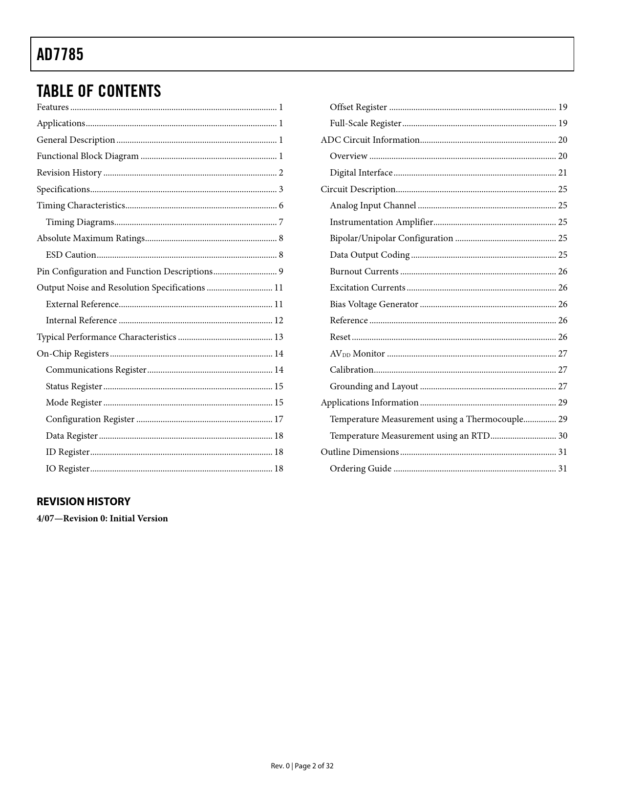 Seiten / Seite33 / 3 — AD7785. TABLE OF CONTENTS. REVISION HISTORY. 4/07—Revision 0: Initial …