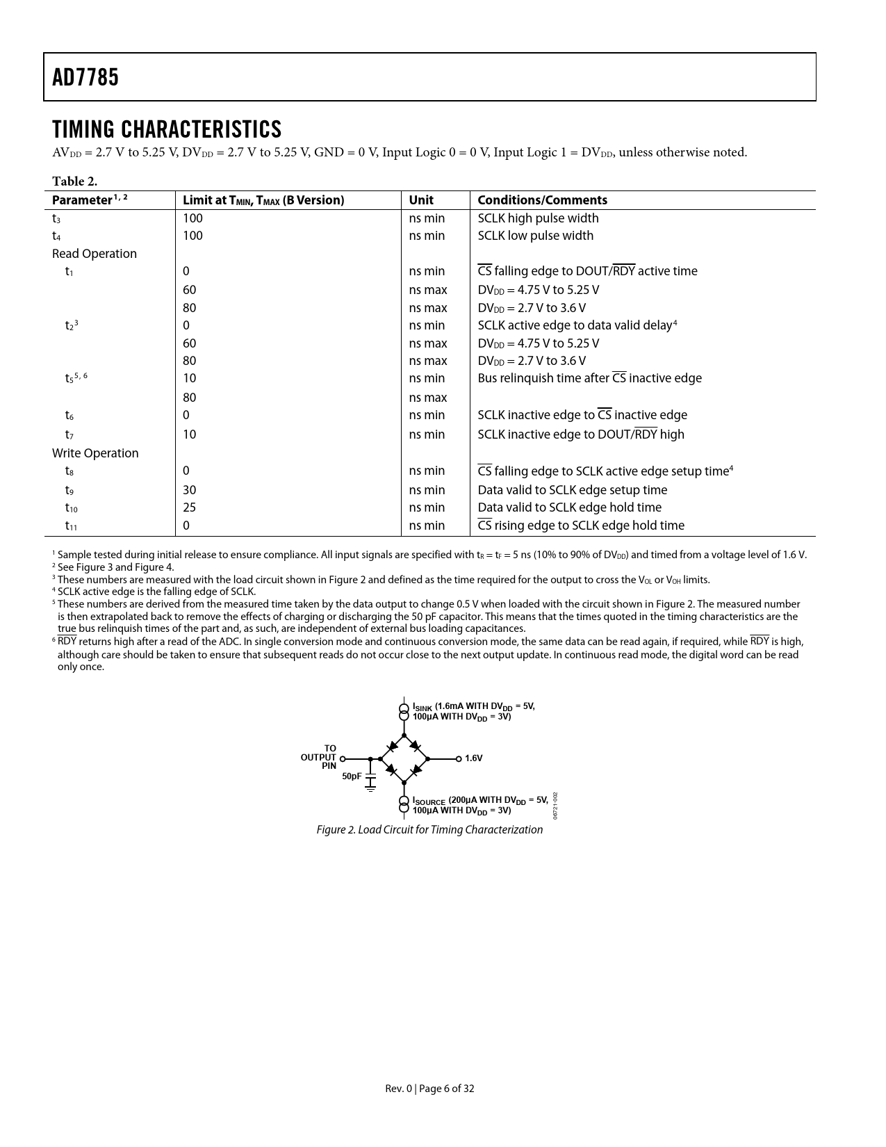 link to page 7 link to page 7 link to page 7 link to page 7 link to page 7 link to page 7 link to page 7 AD7785TIMING CHARACTERISTICS AVDD = 2.7 V to 5.25 V, DVDD = 2.7 V to 5.25 V, GND = 0 V, Input Logic 0 = 0 V, Input Logic 1 = DVDD, unless otherwise noted. Table 2. Parameter1, 2Limit at TMIN, TMAX (B Version)UnitConditions/Comments t3 100 ns min SCLK high pulse width t4 100 ns min SCLK low pulse width Read Operation t1 0 ns min CS falling edge to DOUT/RDY active time 60 ns max DVDD = 4.75 V to 5.25 V 80 ns max DVDD = 2.7 V to 3.6 V t 3 2 0 ns min SCLK active edge to data valid delay4 60 ns max DVDD = 4.75 V to 5.25 V 80 ns max DVDD = 2.7 V to 3.6 V t 5, 6 5 10 ns min Bus relinquish time after CS inactive edge 80 ns max t6 0 ns min SCLK inactive edge to CS inactive edge t7 10 ns min SCLK inactive edge to DOUT/RDY high Write Operation t8 0 ns min CS falling edge to SCLK active edge setup time4 t9 30 ns min Data valid to SCLK edge setup time t10 25 ns min Data valid to SCLK edge hold time t11 0 ns min CS rising edge to SCLK edge hold time 1 Sample tested during initial release to ensure compliance. All input signals are specified with tR = tF = 5 ns (10% to 90% of DVDD) and timed from a voltage level of 1.6 V. 2 See Figure 3 and Figure 4. 3 These numbers are measured with the load circuit shown in Figure 2 and defined as the time required for the output to cross the VOL or VOH limits. 4 SCLK active edge is the falling edge of SCLK. 5 These numbers are derived from the measured time taken by the data output to change 0.5 V when loaded with the circuit shown in Figure 2. The measured number is then extrapolated back to remove the effects of charging or discharging the 50 pF capacitor. This means that the times quoted in the timing characteristics are the true bus relinquish times of the part and, as such, are independent of external bus loading capacitances. 6 RDY returns high after a read of the ADC. In single conversion mode and continuous conversion mode, the same data can be read again, if required, while RDY is high, although care should be taken to ensure that subsequent reads do not occur close to the next output update. In continuous read mode, the digital word can be read only once. ISINK (1.6mA WITH DVDD = 5V,100µA WITH DVDD = 3V)TOOUTPUT1.6VPIN50pF 02 I -0 SOURCE (200µA WITH DVDD = 5V, 21 100µA WITH DVDD = 3V) 67 0 Figure 2. Load Circuit for Timing Characterization Rev. 0 | Page 6 of 32 Document Outline FEATURES APPLICATIONS GENERAL DESCRIPTION FUNCTIONAL BLOCK DIAGRAM TABLE OF CONTENTS REVISION HISTORY SPECIFICATIONS TIMING CHARACTERISTICS TIMING DIAGRAMS ABSOLUTE MAXIMUM RATINGS ESD CAUTION PIN CONFIGURATION AND FUNCTION DESCRIPTIONS OUTPUT NOISE AND RESOLUTION SPECIFICATIONS EXTERNAL REFERENCE INTERNAL REFERENCE TYPICAL PERFORMANCE CHARACTERISTICS ON-CHIP REGISTERS COMMUNICATIONS REGISTER RS2, RS1, RS0 = 0, 0, 0 STATUS REGISTER RS2, RS1, RS0 = 0, 0, 0; Power-On/Reset = 0x88 MODE REGISTER RS2, RS1, RS0 = 0, 0, 1; Power-On/Reset = 0x000A CONFIGURATION REGISTER RS2, RS1, RS0 = 0, 1, 0; Power-On/Reset = 0x0710 DATA REGISTER RS2, RS1, RS0 = 0, 1, 1; Power-On/Reset = 0x00000F ID REGISTER RS2, RS1, RS0 = 1, 0, 0; Power-On/Reset = 0xXB IO REGISTER RS2, RS1, RS0 = 1, 0, 1; Power-On/Reset = 0x00 OFFSET REGISTER RS2, RS1, RS0 = 1, 1, 0; Power-On/Reset = 0x800000 FULL-SCALE REGISTER RS2, RS1, RS0 = 1, 1, 1; Power-On/Reset = 0x5XXX00 ADC CIRCUIT INFORMATION OVERVIEW DIGITAL INTERFACE Single Conversion Mode Continuous Conversion Mode Continuous Read CIRCUIT DESCRIPTION ANALOG INPUT CHANNEL INSTRUMENTATION AMPLIFIER BIPOLAR/UNIPOLAR CONFIGURATION DATA OUTPUT CODING BURNOUT CURRENTS EXCITATION CURRENTS BIAS VOLTAGE GENERATOR REFERENCE RESET AVDD MONITOR CALIBRATION GROUNDING AND LAYOUT APPLICATIONS INFORMATION TEMPERATURE MEASUREMENT USING A THERMOCOUPLE TEMPERATURE MEASUREMENT USING AN RTD OUTLINE DIMENSIONS ORDERING GUIDE