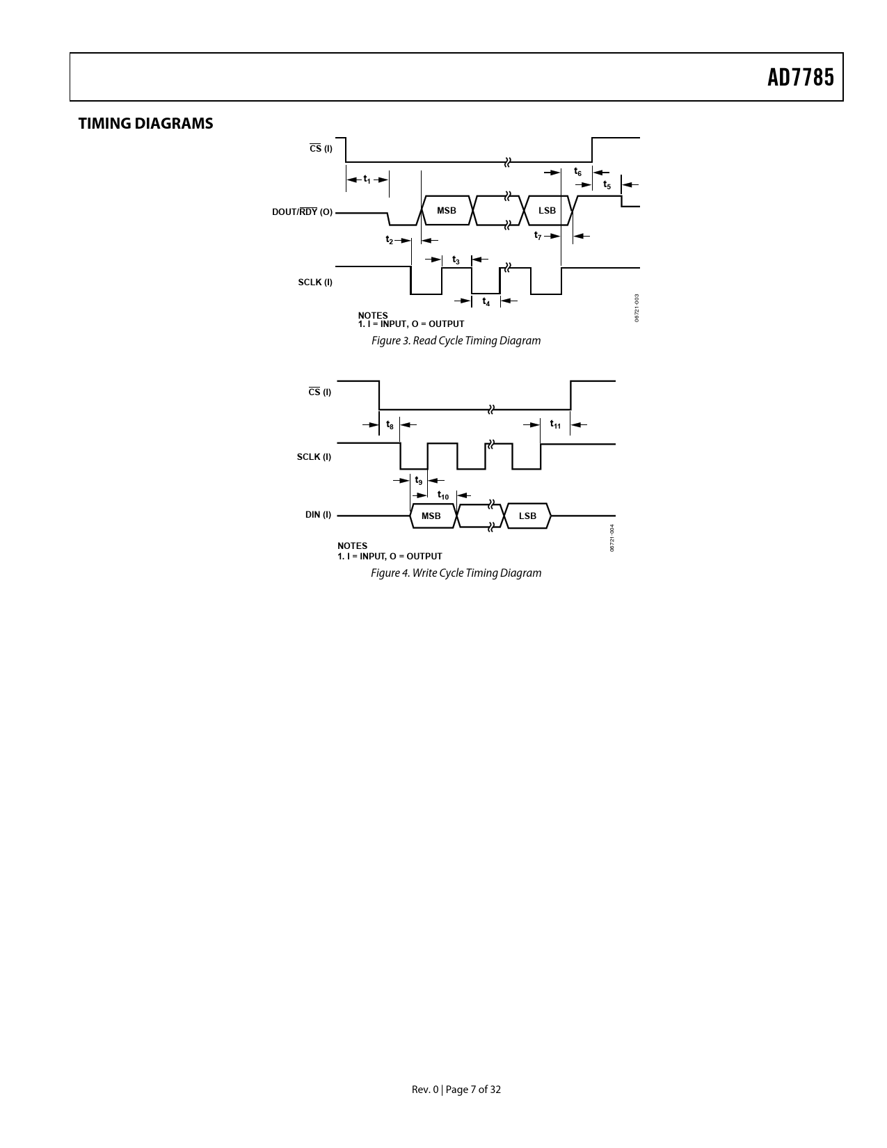 AD7785. TIMING DIAGRAMS. CS (I). DOUT/RDY (O). MSB. LSB. SCLK (I). NOTES. 1. I = INPUT, O = OUTPUT. t11. t10. DIN (I)