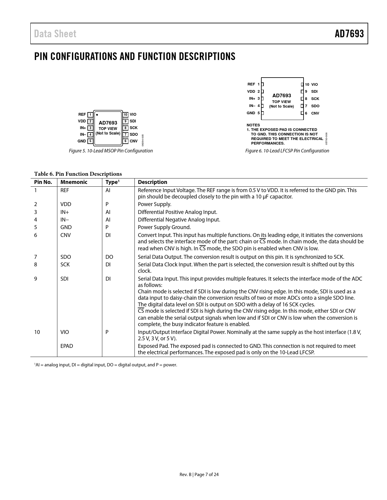 Data Sheet AD7693 PIN CONFIGURATIONS AND FUNCTION DESCRIPTIONS REF 1 10 VIO VDD 2 9 SDI AD7693 IN+ 3 8 SCK TOP VIEW IN– 4 (Not to Scale) 7 SDO REF GND 5 6 CNV 1 10 VIO VDD 2 9 SDI AD7693 NOTES IN+ 3 8 SCK TOP VIEW 1. THE EXPOSED PAD IS CONNECTED IN– 4 (Not to Scale) 7 SDO